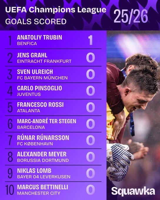 根据Squawka的数据统计,本赛季欧冠赛场上,仅有一名门将取得进球,那就是特鲁宾。