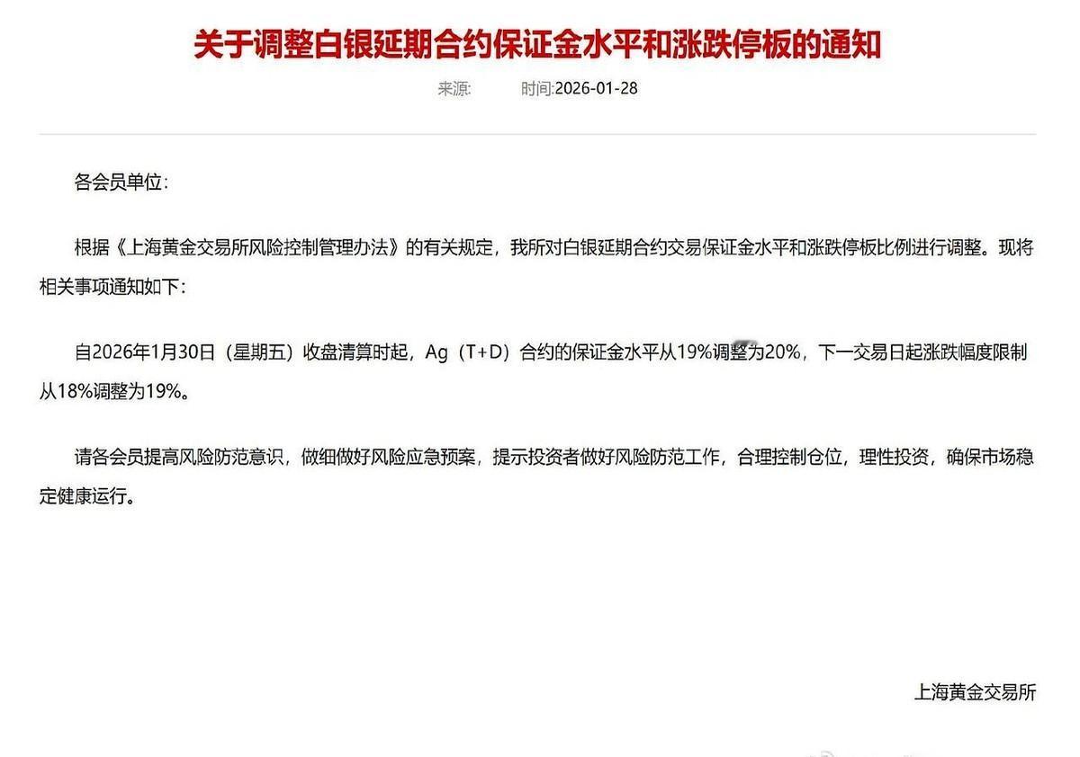 黄金白银这波行情,已经不是“涨疯了”三个字能形容的了。 19天,黄金直接干上去20%,白银更猛,直接冲了50%。办公室里,连从来不看盘的保洁阿姨,都在问怎么开户。 但就在所有人盯着屏幕上那根冲天的红线,盘算着下一笔钱是该买房还是换车的时候,牌桌上那只看不见的手,动了。 大半夜,上海黄金交易所和期货交易所,悄无声息地,同时甩出两份通知。 没说别的,就两件事。 第一,想上桌玩?可以,兜里的本钱再多掏点出来。这是调高保证金。 第二,一天之内能涨多少、跌多少,那个口子给你收紧了。这是调整涨跌停板。 翻译过来就一句话:怕你们玩脱了,用规则把缰绳给你勒紧一点。 等于说,楼下还在敲锣打鼓地开香槟,楼上的主人已经站在窗边,默默地看着下面,顺手就把消防栓的保险给打开了。 更有意思的是,就在金价银价一飞冲天的时候,隔壁的钻石柜台,价格牌上的数字却在一路往下掉。 甚至有新闻说,一个姑娘吃辣条,居然从里面吃出了一根小金条。 你看,当一群人还在为千分之一的波动通宵鏖战时,另一群人,已经把黄金当成了避险的最后一块木板,还有人,纯粹是运气好。 说白了,这就是在告诉你:这泼天的富贵可以轮流转,但谁要是想把桌子给掀了,那不行。