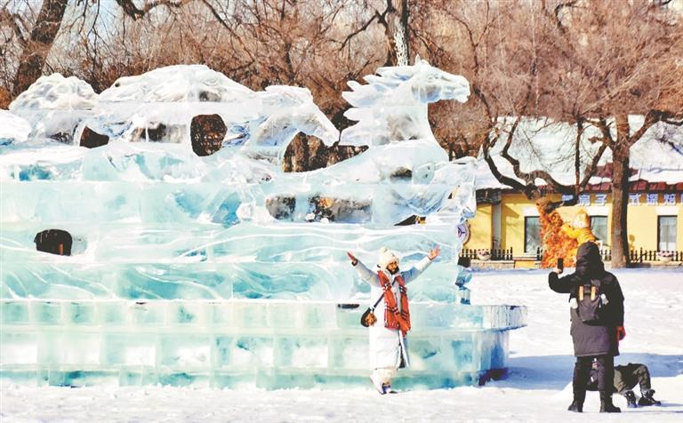 冬日里,哈尔滨市南岗区花园街历史文化街区内,每天都有许多游客前来打卡拍照。街区里打造的十余座冰雕,构思新颖,造型精美,鬼斧神工,为当地增添了一道美丽风景。