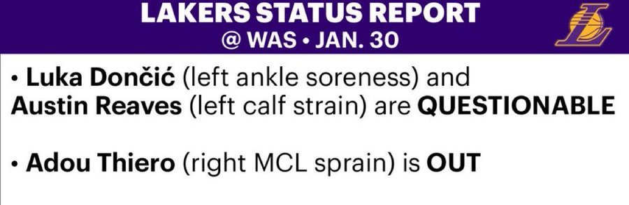 虎扑01月30日讯今日,湖人在官方社媒上公布了对阵奇才比赛的伤病名单情况,内容如下