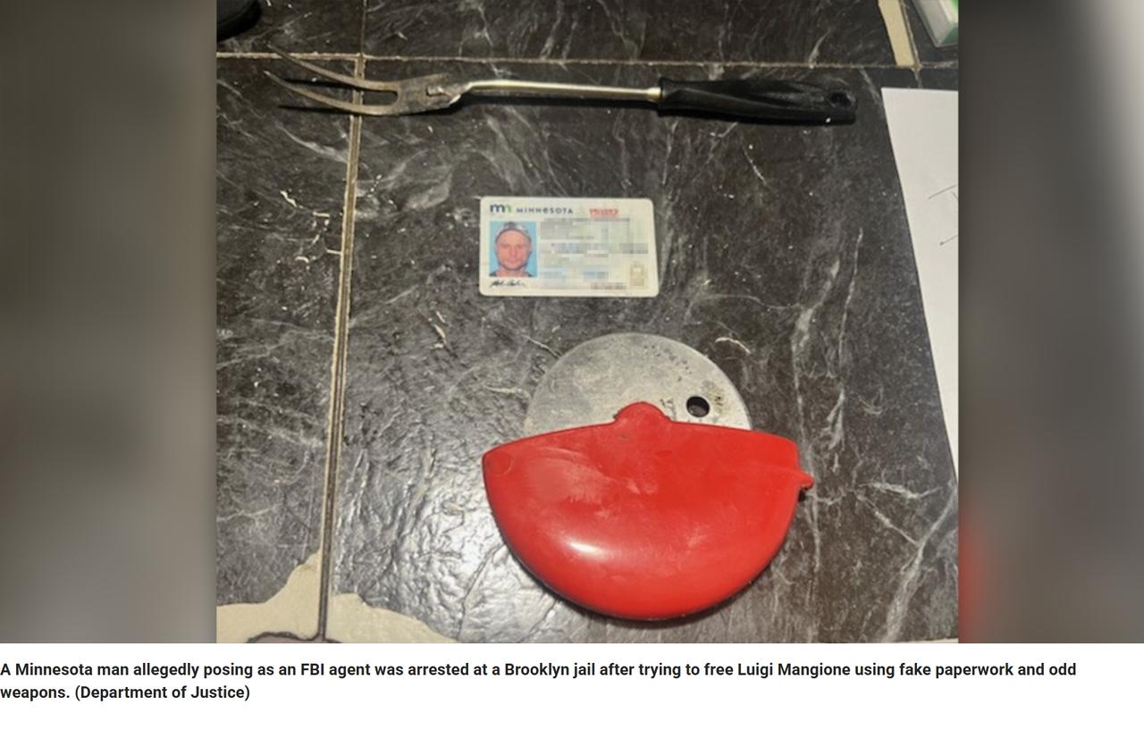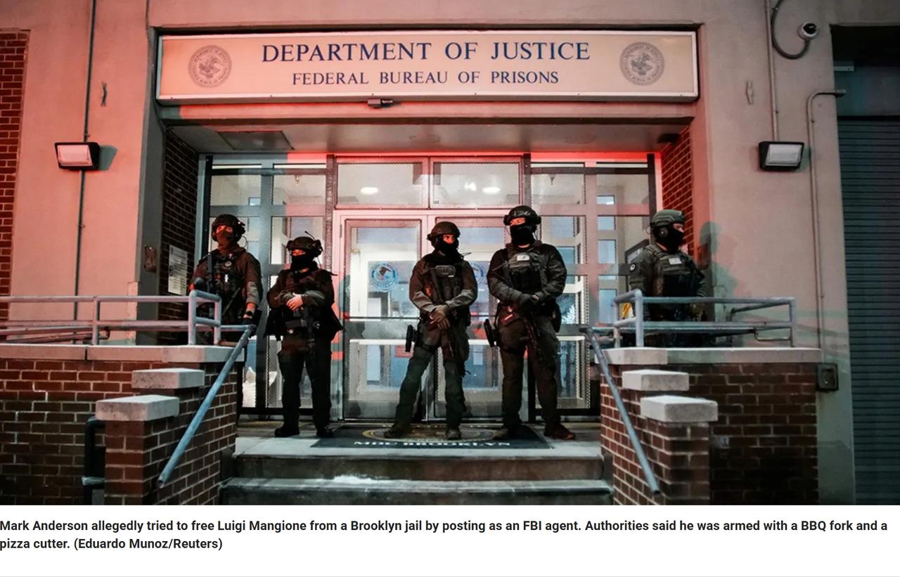美国男子冒充FBI,试图从监狱中营救路易吉·曼吉奥内 当地时间周三,一名明尼苏达州男子携带烧烤叉和披萨刀,在布鲁克林监狱被捕,涉嫌冒充联邦调查局特工试图将知名囚犯路易吉·曼吉奥内从监狱中救出。 根据纽约东区法院提交的刑事起诉书,马克·安德森在大都会拘留中心被捕,原因是他声称持有允许释放囚犯的法院命令。 虽然起诉书未提及安德森试图释放的囚犯姓名,但一位执法消息人士透露,那名囚犯是路易吉·曼吉奥内,即被指控于2024年12月杀害联合医疗公司首席执行官布莱恩·汤普森的男子。 据称安德森大约在下午6:50走近监狱接收区,告诉身穿制服的联邦监狱局官员,他是一名携带“法官签署文件”的联邦调查局特工。 当被要求提供联邦证件时,安德森出示了明尼苏达州的驾照,并声称携带武器,给了监狱警员一叠文件,一名联邦调查局特工称这些文件是针对美国司法部的指控。 纽约市警察局和联邦调查局随后赶来,搜查了安德森的背包,发现了一个大型烧烤叉和一个披萨刀,安德森被联邦拘留。 安德森现被控冒充联邦官员,这是一项重罪,最高可判处三年监禁。