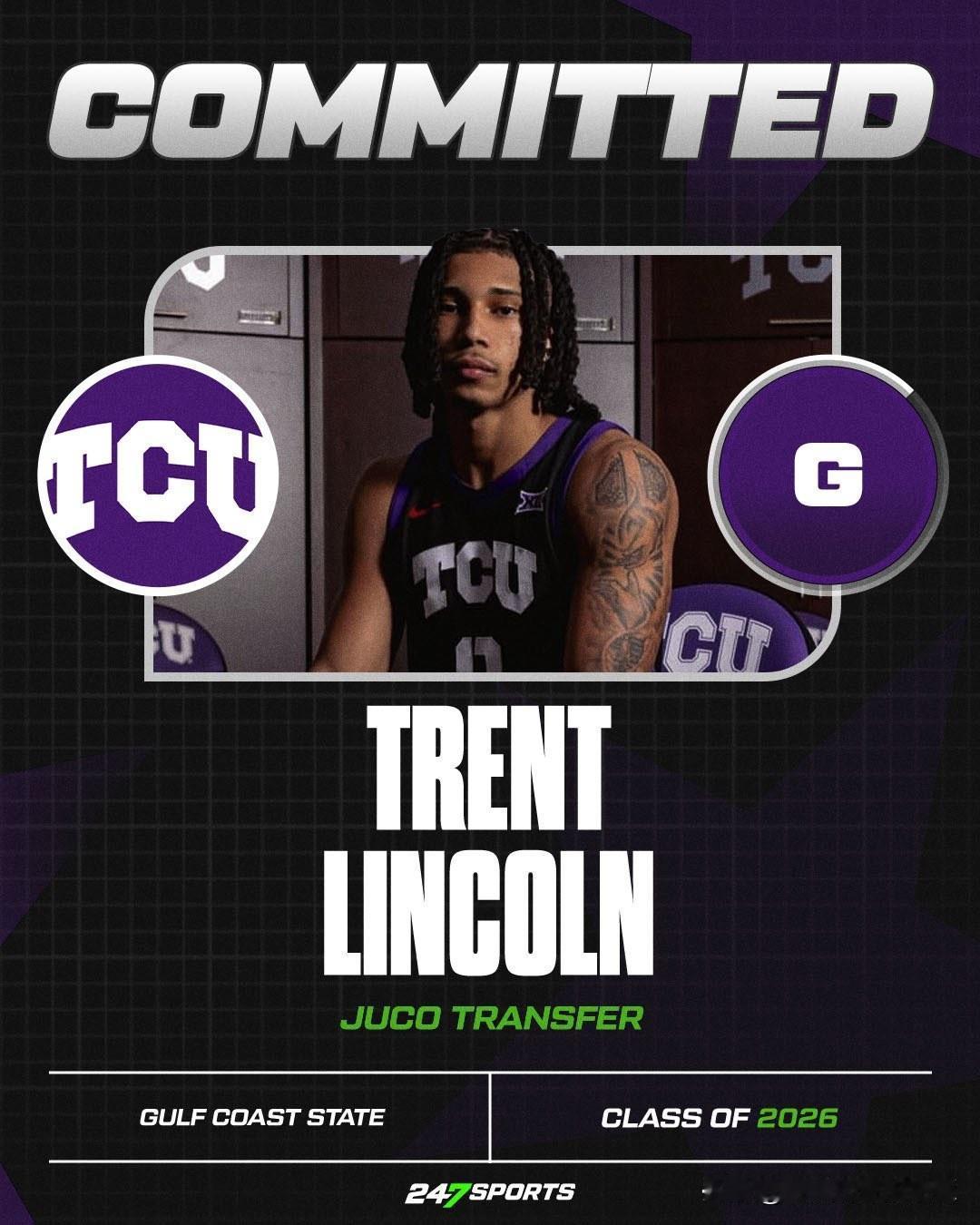 JUCO控卫Trent Lincoln宣布承诺加盟TCU,还访问过堪萨斯大学,来自马里兰州巴尔的摩,身高6-3=191,本赛季效力于佛罗里达州Gulf Coast State College场均得到19.7分6.1助攻4.3篮板,Frogs连续两个赛季得到JUCO排名第一的承诺,之前还有前锋Xavier Edmonds。
