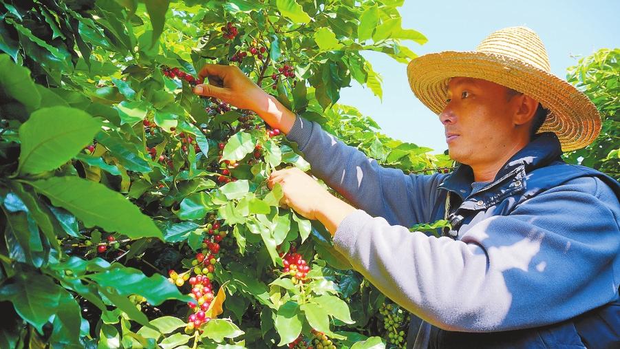 保山市隆阳区新寨村村民采摘咖啡。记者杨艳鹏摄