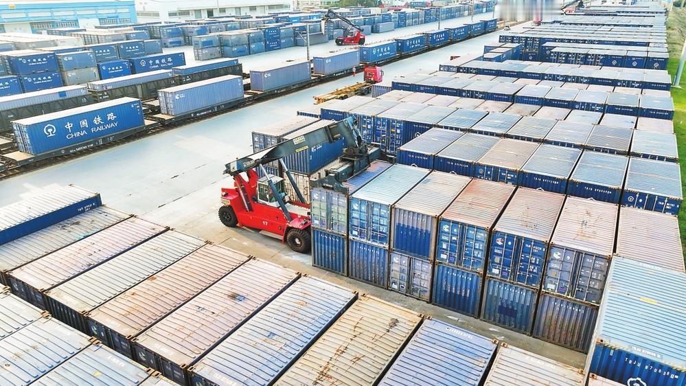 中老铁路“澜湄快线”国际货运列车吊装货物。通讯员周靖博摄