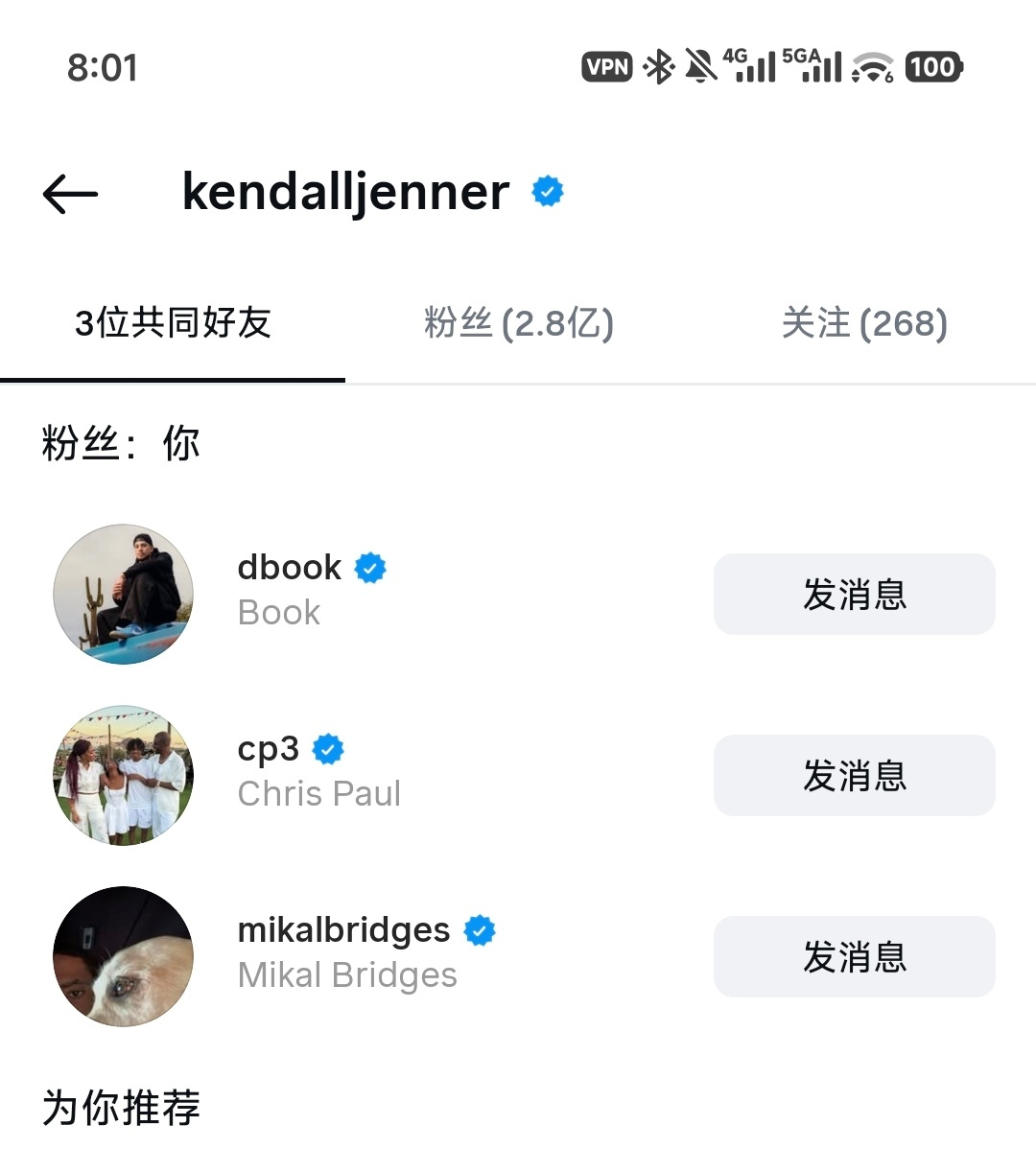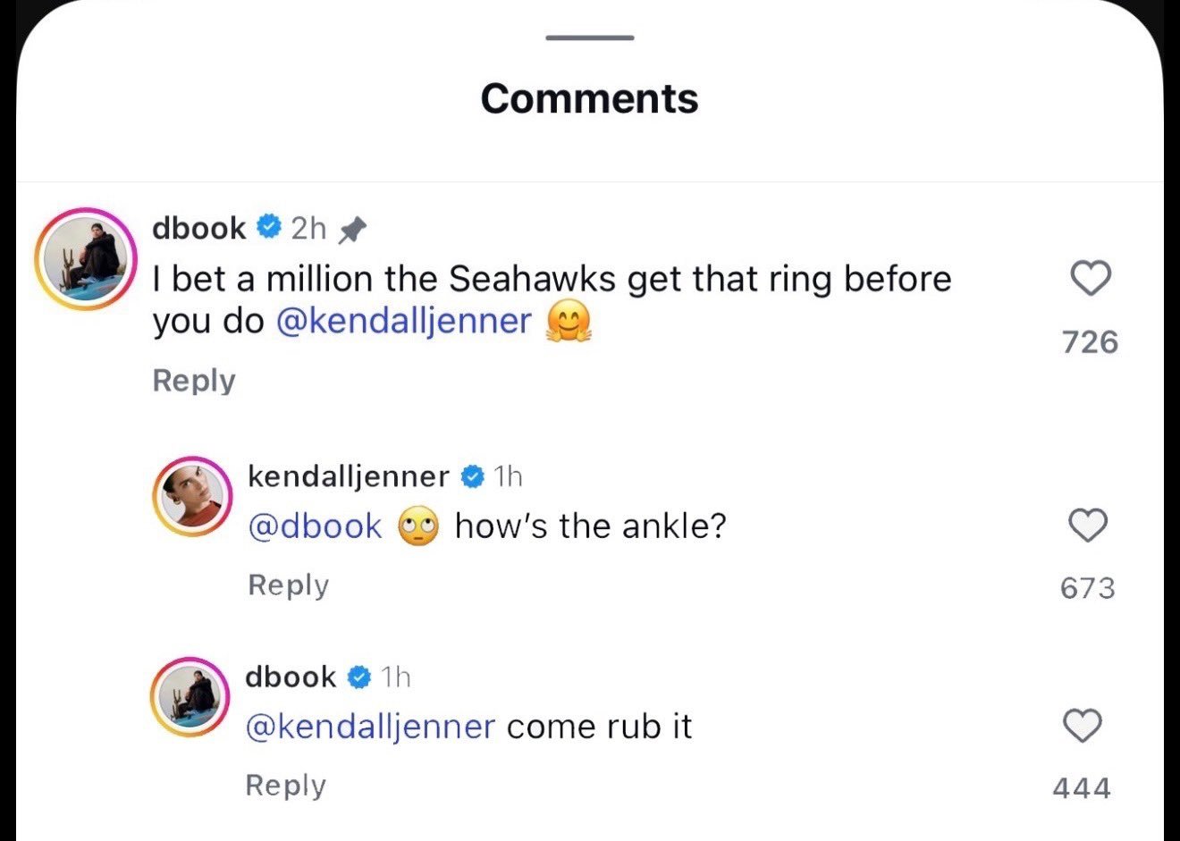 Kendall Jenner参加了吉米秀,并在节目中宣传了她与Fanatics Sportsbook合作的超级碗广告。而布克则在Instagram的评论里艾特了她,并说:“我赌100万,西雅图海鹰队拿到戒指比你早”。肯豆回复了布克:“🙄你脚踝怎么样了?”布克挑逗的回复了句:“来摸一下。”布克还重新关注了詹娜,但是詹娜没有回关活塞vs太阳菲尼克斯太阳