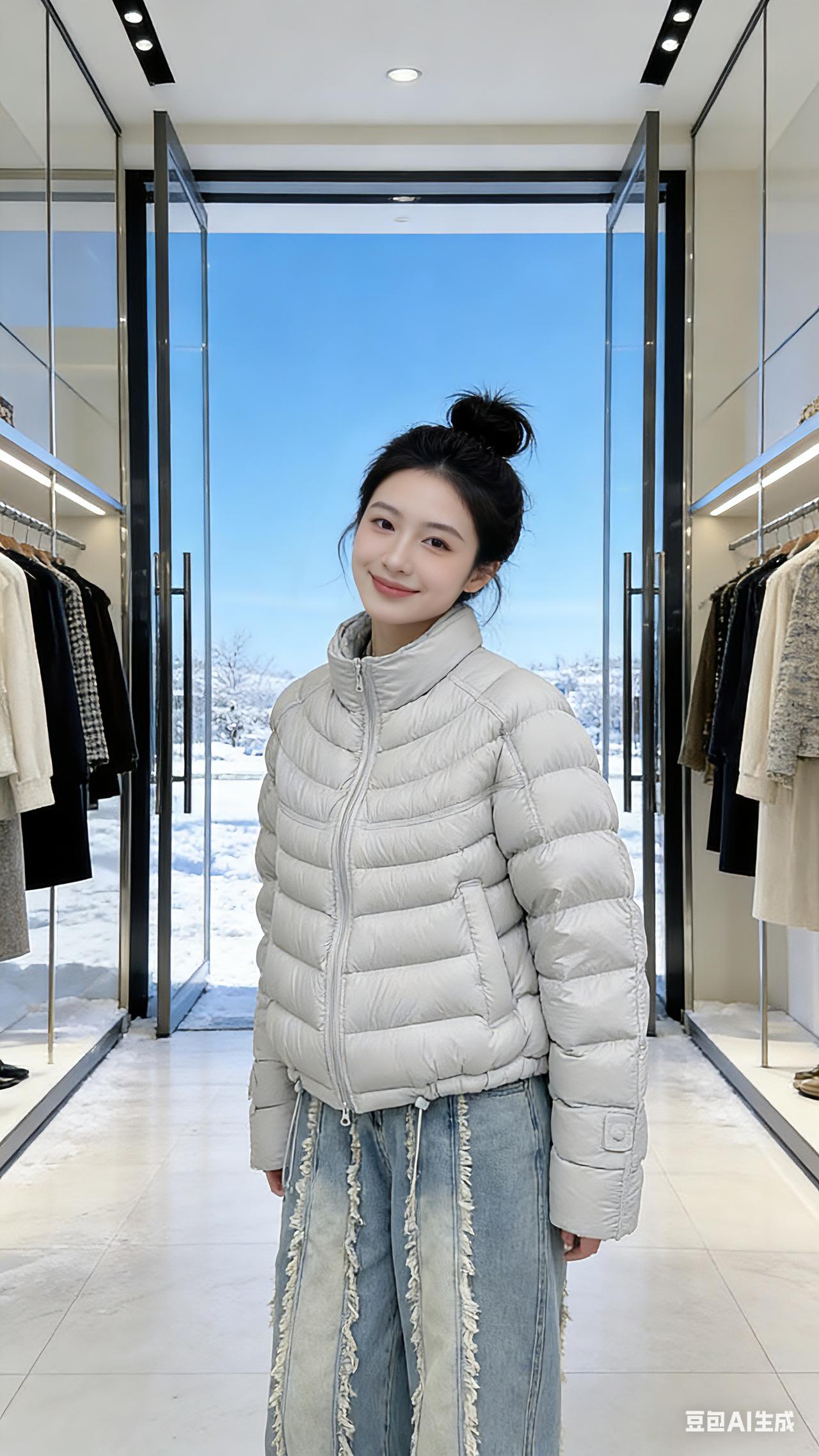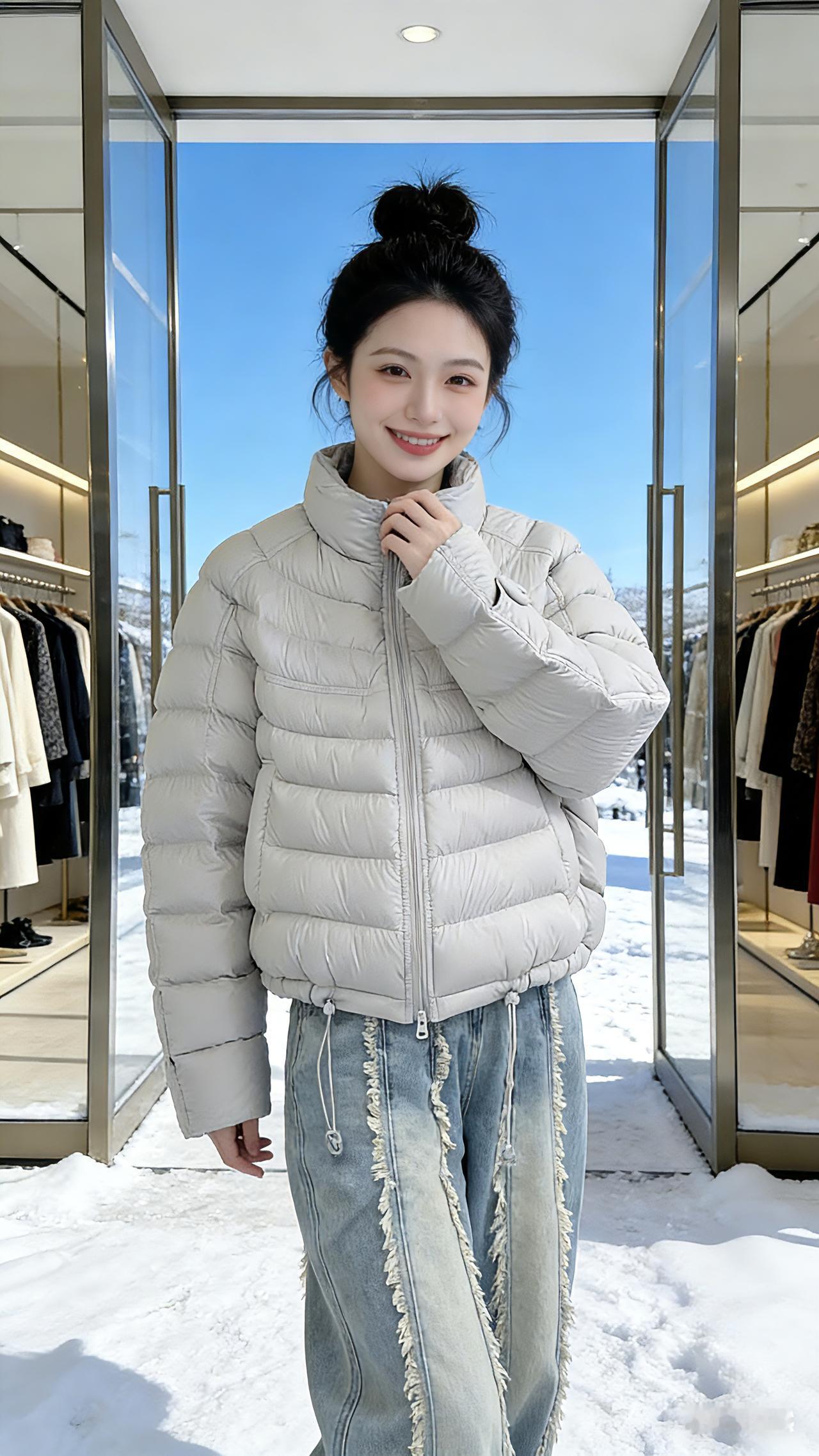 浅灰羽绒与雪日的温柔对话 浅灰色的羽绒服裹着一身蓬松的暖意,像把冬日的阳光揉进了衣料里。 少女站在店铺的玻璃门前,身后是落了雪的街道,蓝天像块干净的幕布,衬得她丸子头的弧度愈发俏皮。她抬手拢了拢立领,羽绒的格纹在光影里泛起细腻的光泽,像给风都裹上了软乎乎的温度。 毛边牛仔裤的流苏垂在雪地靴上,走动时带起细碎的雪粒。她侧身时,羽绒服的线条顺着肩背滑出流畅的弧度,把街头的清冷都隔在了衣料之外。玻璃门映着她的身影,暖黄的店内灯光和室外的蓝天撞在一起,让这一身浅灰成了温柔的过渡。 她笑着比出剪刀手,阳光落在笑涡里,比羽绒服更暖。风掠过店门口的衣架,带起衣料轻响,她却站得安稳,像把这雪日的松弛感,都穿在了身上。 高级感穿搭 新年穿搭 冬季穿搭 棉衣棉服