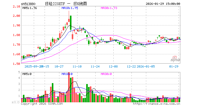 1月29日,日经225ETF(513880)跌0.84%,成交额1.26亿元。当日份额增加50.00万份,最新份额为12.26亿份,近20个交易日份额增加600.00万份。最新资产净值计算值为21.49亿元。