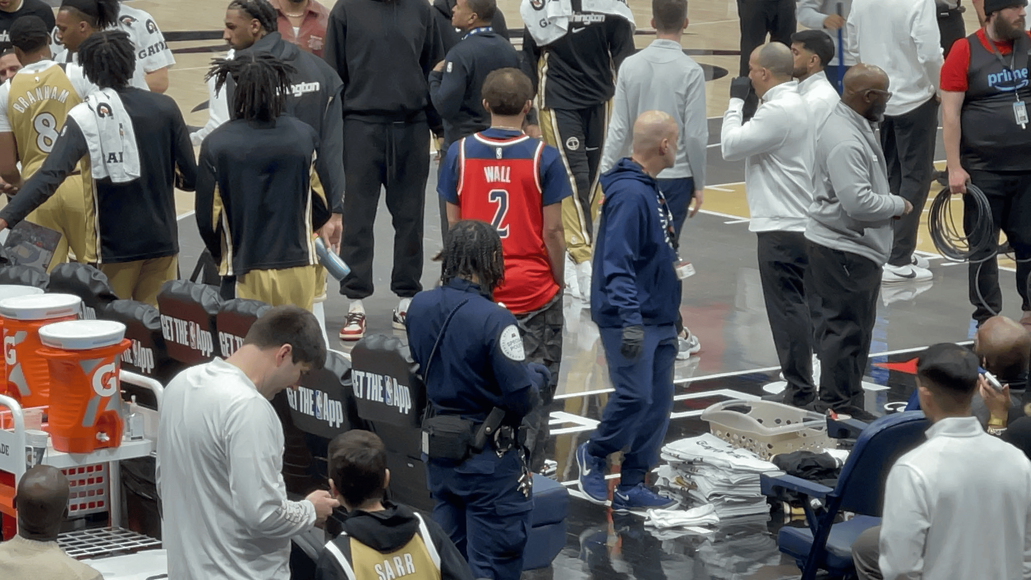 特雷-杨今日身穿约翰-沃尔2号球衣场边观战,中场休息期间奇才将为约翰-沃尔举行纪念仪式。