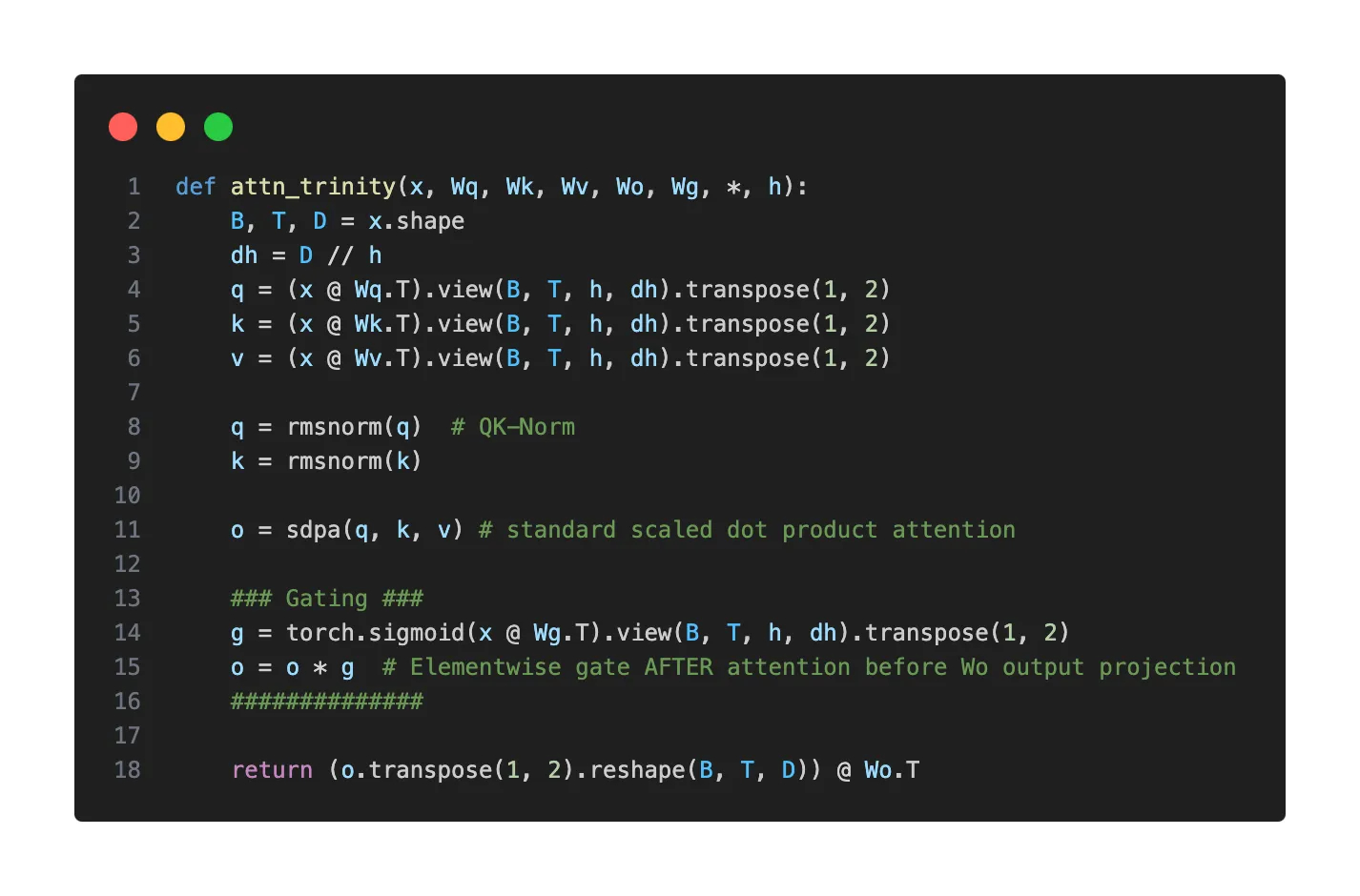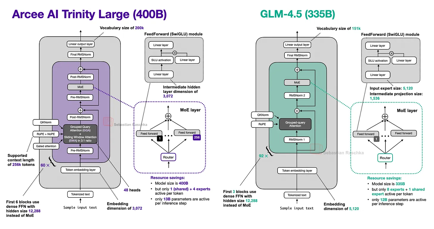 难得一见的美国开源模型:Arcee AI发布的 Trinity Large模型,参数400B,激活13B。用2000个 B300 GPU 训练(国内厂商投来羡慕的目光).----------------以下为Sebastian Raschka对其架构的驾照距离上一次 LLM 架构的更新已经有一段时间了。1 月 27 日,Arcee AI(一家此前我并未关注过的公司)开始在模型枢纽(Model Hub)上发布其 400B Trinity Large 开源权重系列模型,以及两个较小的变体版本。其旗舰级大模型是一个拥有 400B 参数的 MoE(混合专家)模型(其中激活参数为 13B)。两个较小的变体分别是 Trinity Mini(26B 参数,3B 激活参数)和 Trinity Nano(6B 参数,1B 激活参数)。图1:Trinity Large 架构概览。除了模型权重外,Arcee AI 还发布了一份细节丰富的技术报告。让我们深入了解一下这款 400B 的旗舰模型。下图将其与此前讨论过的 GLM 4.5(第 11 节)进行了对比,后者在规模上与之最为接近。此外,Trinity 的技术报告显示,Trinity Large 与 GLM-4.5 基础模型(Base model)的建模性能几乎完全一致(我推测他们没有与更近期的基础模型对比,是因为现在许多公司只分享微调后的模型)。图2:Arcee AI Trinity Large 与规模相近的 GLM 4.5 对比(400B vs 335B)。我们可以看到,Trinity 模型中加入了一些有趣的架构组件。首先,它采用了类似 Gemma 3、Olmo 3、小米 MiMo 等模型中出现的 局部/全局交替(滑动窗口)注意力层。但它并没有使用 Gemma 3 和小米常用的 5:1 比例,而是选择了与 Olmo 3 类似的 3:1 比例,且滑动窗口大小为 4096(也与 Olmo 3 相似)。除了 QK-Norm(在第 2 节 Olmo 2 中涵盖)之外,他们在全局层中使用了 NoPE(我们在第 7 节 SmolLM3 中讨论过)。他们还采用了一种形式的门控注意力(Gated Attention)。虽然不是完整的 GatedDeltaNet(见第 12 节),但使用了一种类似于 Qwen3-Next 注意力机制中的门控方式。具体来说,他们修改了标准注意力机制:在输出线性投影之前,对缩放点积(Scaled dot-product)结果添加了逐元素门控(Elementwise Gating)(如下图所示)。这种做法减少了注意力汇聚(Attention Sinks)现象,提升了长序列的泛化能力,并有助于增强训练稳定性。图3:Trinity Large 在注意力机制中所使用的门控机制示意图。你可能已经注意到,在之前的 Trinity Large 架构图中使用了四个(而非两个)RMSNorm 层。这就是所谓的 “深度缩放三明治归一化”(Depth-scaled sandwich norm)。虽然这是基于前人的研究,但在主流架构中我还从未见过。整体上看,它的 RMSNorm 布局类似于 Gemma 3,但不同之处在于,每个块中第二个 RMSNorm 的增益是随深度缩放的——这意味着其初始值约为 1/L(L 为总层数)。因此,在训练初期,残差更新量很小,并随着模型学习到正确的尺度而逐渐增大。其 MoE(混合专家系统) 采用了类似 DeepSeek 的结构,拥有大量的小型专家,但为了提高推理吞吐量,他们将其处理得更“粗粒度”一些(我们在 Mistral 3 Large 采用 DeepSeek V3 架构时也看到过类似做法)。HOW I AI