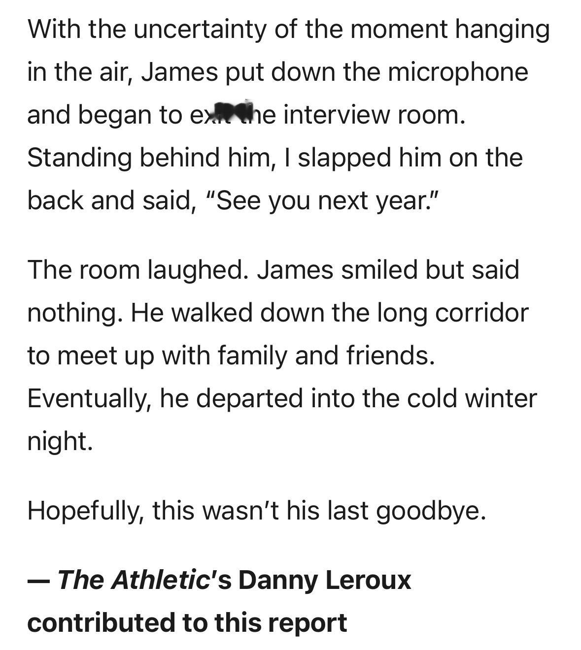 骑士记者Jason Lloyd线下招募詹姆斯:“我还能从这颗橙子里榨出多少汁水?”詹姆斯说道,“我还能怎样和时间老人对抗?我甚至把这当成一种较劲,看看自己还能击败他多少次。但有一点可以肯定,我绝不会成为那种连走下赛场都费劲的球员。”现场弥漫着未来未卜的氛围,詹姆斯放下话筒,准备离开采访室。我站在他身后,拍了拍他的后背,说了一句:“明年见。”房间里的人都笑了。詹姆斯嘴角上扬,却一言不发。他走过长长的走廊,去与家人朋友会合,最终消失在冬日寒冷的夜色中。但愿,这不是他最后的告别。