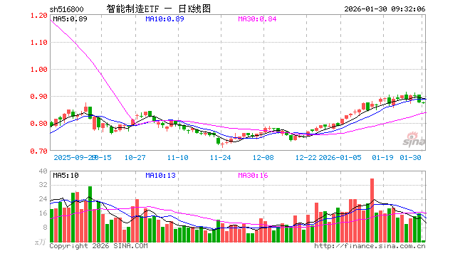 智能制造ETF(516800)业绩比较基准为中证智能制造主题指数收益率,管理人为华宝基金管理有限公司,基金经理为张放,成立(2021-01-29)以来回报为75.56%,近一个月回报为11.04%。
