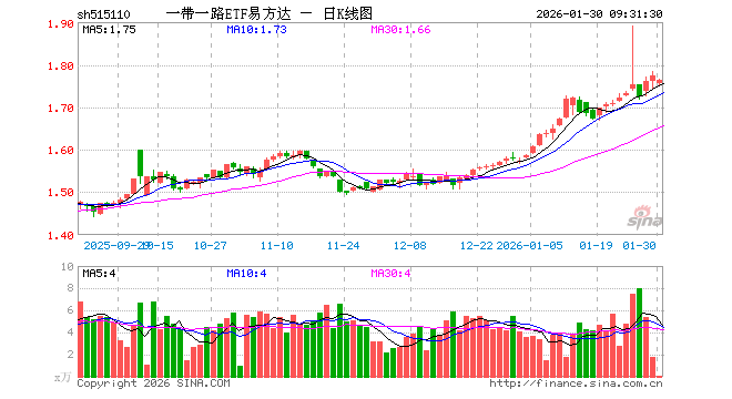 1月30日,一带一路ETF易方达(515110)开盘跌1.02%,报1.755元。一带一路ETF易方达(515110)重仓股方面,小商品城开盘跌1.30%,金风科技涨0.04%,中国铝业跌6.37%,烽火通信跌1.41%,东阿阿胶涨0.10%,南网能源跌1.48%,广东宏大跌0.20%,云铝股份跌3.76%,建设银行涨0.00%,中国联通跌0.58%。