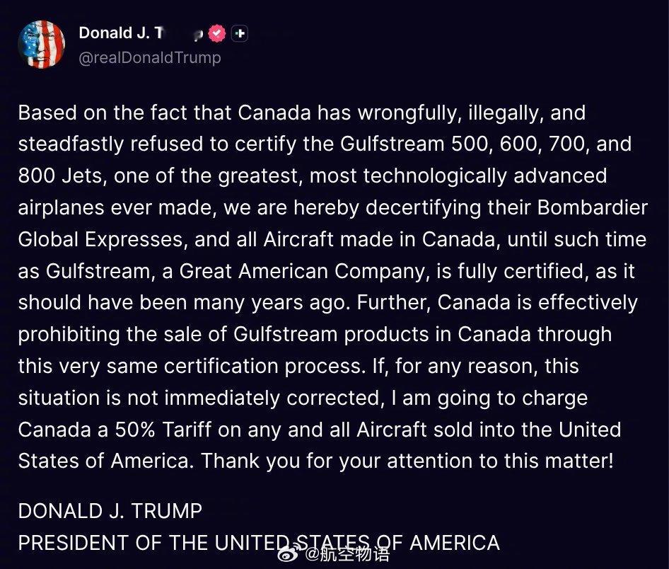 【楽,川普对加拿大产飞机下狠手!】川普对加拿大暴怒发文宣布取消所有加拿大制造飞机的认证,并宣布对加拿大征收50%的关税,直到他们停止拒绝认证湾流飞机为止。“鉴于加拿大错误地、非法地、顽固地拒绝为湾流G500、600、700和800型喷气式飞机(有史以来最伟大、技术最先进的飞机之一)颁发认证,我们特此取消其庞巴迪环球快车飞机以及所有在加拿大制造的飞机的认证,直至湾流这家伟大的美国公司获得全面认证为止,而这本应在多年前就获得认证。此外,加拿大实际上通过同样的认证程序禁止湾流产品在加拿大销售。如果这种情况不能立即得到纠正,我将对所有销往美国的飞机向加拿大征收50%的关税。感谢您对此事的关注!”
