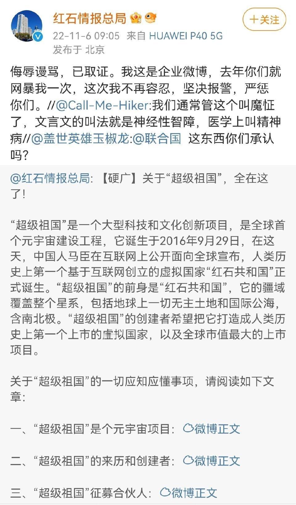 大家应该都看过这篇2018年要求中国在贸易战向美国投降的文章,已经成为笑话了,这叫马臣的人,现在的微博是,他自己建了个“网络共和国”,想要统治全太阳系。还含元宇宙区块链ai等技术。没错,范围不仅仅是全球,还包括太阳系。之前我嘲笑了一下,他说要出动他的红石共和国警察来通缉我。