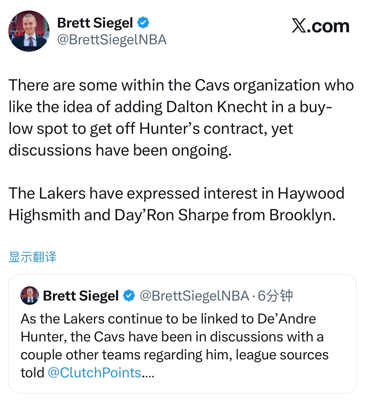 NBA记者Brett Siegel:尽管湖人持续与亨特产生交易传闻,但骑士队已经在和其他多支球队就亨特的交易展开谈判。篮网队被提及有望成为第三方球队,协助完成薪资匹配相关的操作。亨特大概率会在2月5日交易截止日前被送走。骑士队内部有部分人士支持通过低价抄底的方式得到克内克特,从而送走亨特的合同,不过相关谈判仍在进行中。湖人方面则已经对篮网队的海伍德-海史密斯以及夏普表达了兴趣。
