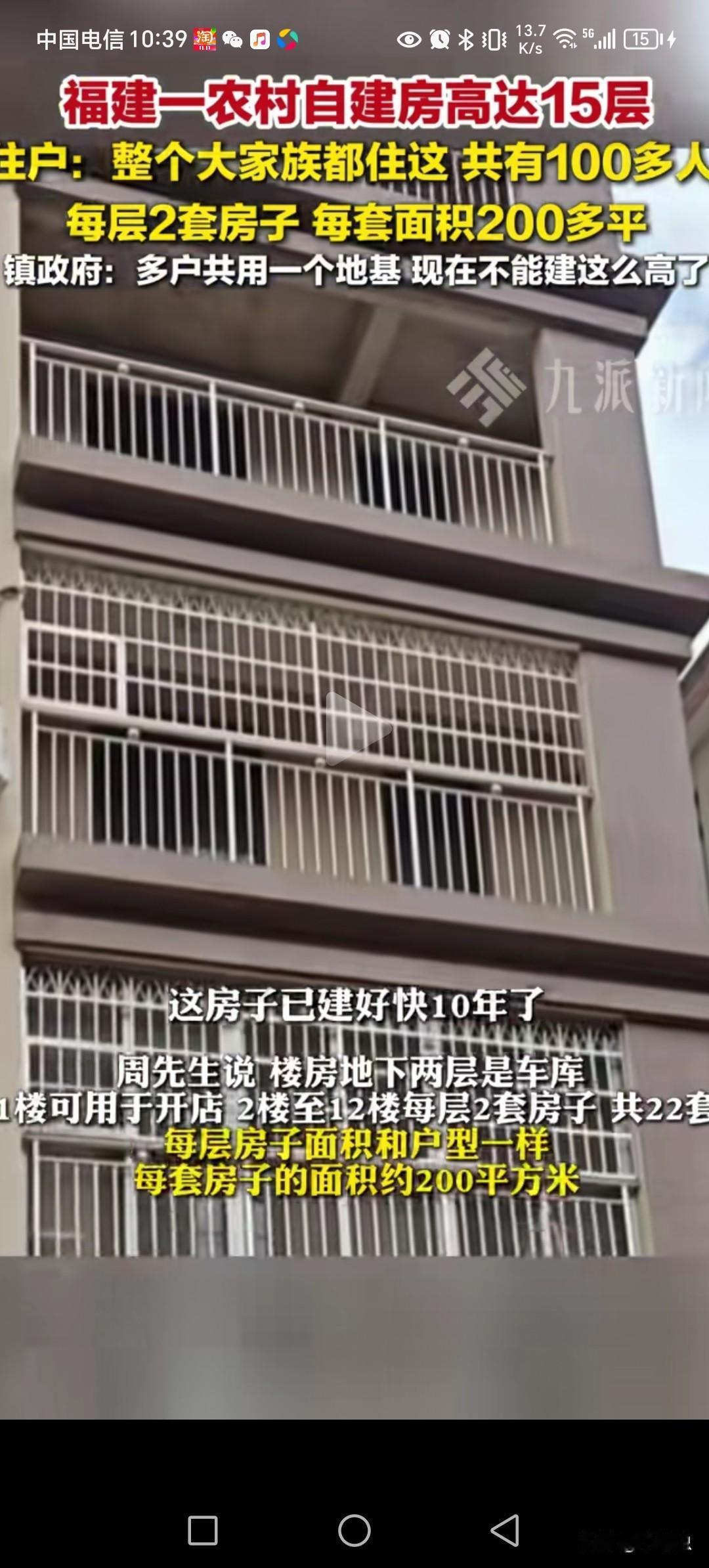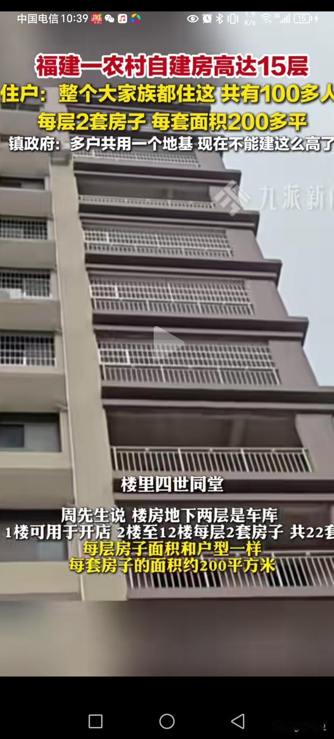 福建山区农村,一户建15层。 100多人大家族居住,四世同堂都住在里面。 每层2套房子,200多平方,算起来挺宽的。 多户一个地基,建设快10年了。 要是现在建设,也没法批准建那么高。 农村这栋最高,家族一起居住。 有利于团结,真的很不错。 过年时候,人非常热闹。