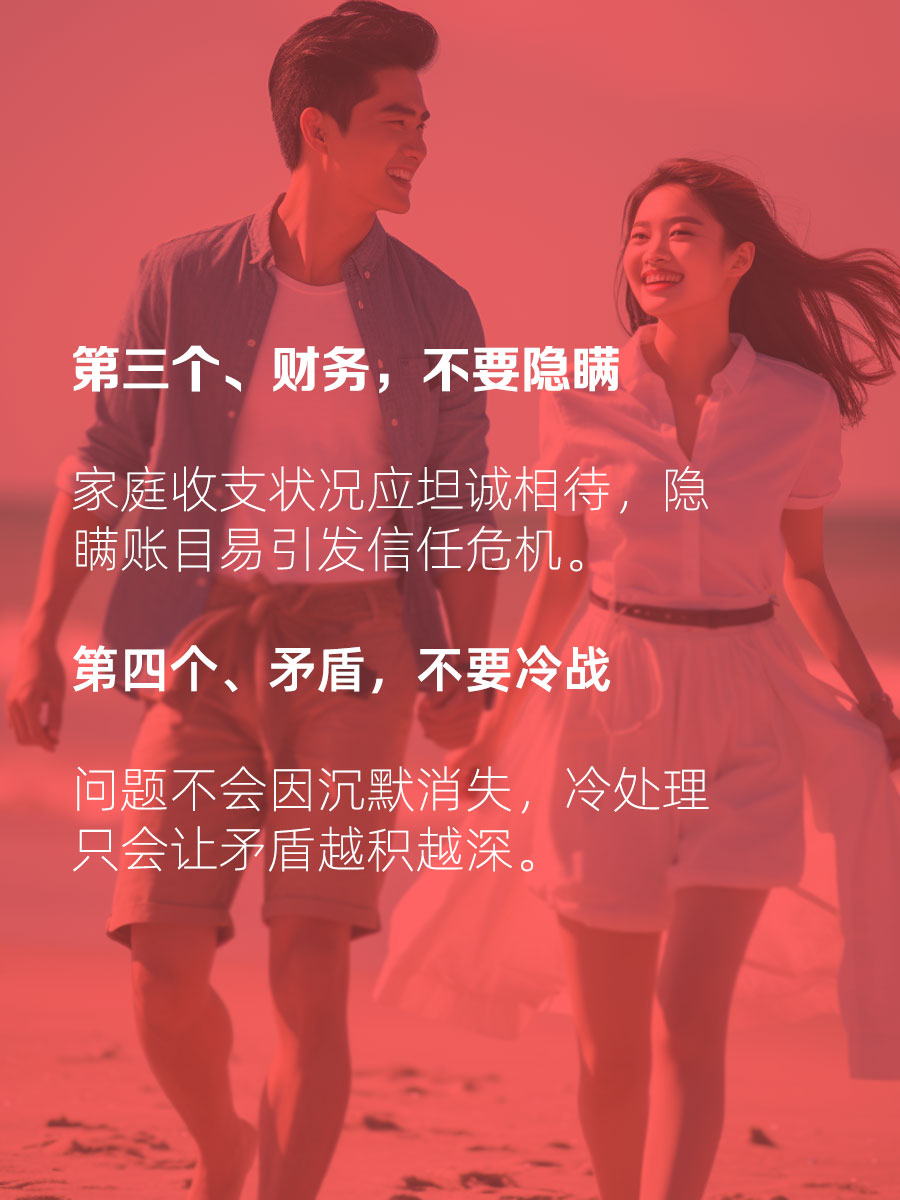 夫妻相处十不要,婚姻从不是轰轰烈烈的誓言,而是细水长流的相处。懂得把握分寸,避开相处雷区,才能让夫妻感情越走越近。分享夫妻相处“十不要”,句句都是实在话: 1. 洗澡不共洗,保留私密与卫生习惯,勿添尴尬; 2. 同房不拒绝,和谐亲密是婚姻根基,忌生隔阂; 3. 财务不隐瞒,收支坦诚相待,杜绝信任危机; 4. 矛盾不冷战,沉默解决不了问题,避免矛盾累积; 5. 社交不干涉,尊重彼此圈子,不限制对方自由; 6. 长辈不指责,善待对方家人,维护家庭和睦; 7. 旧事不重提,过往矛盾翻篇,勿引新的争吵; 玩笑不过火,幽默增情趣,不伤害对方自尊; 承诺不食言,言出必行,勿让伴侣失望; 付出不计较,夫妻本一体,勿让感情变味。 夫妻之间,没有完美的相处模式,只有懂得包容和体谅的两个人。守住这些相处底线,少一点挑剔,多一点珍惜,婚姻才能安稳长久❤️#夫妻# #夫妻关系# #婚姻里的甜蜜瞬间#