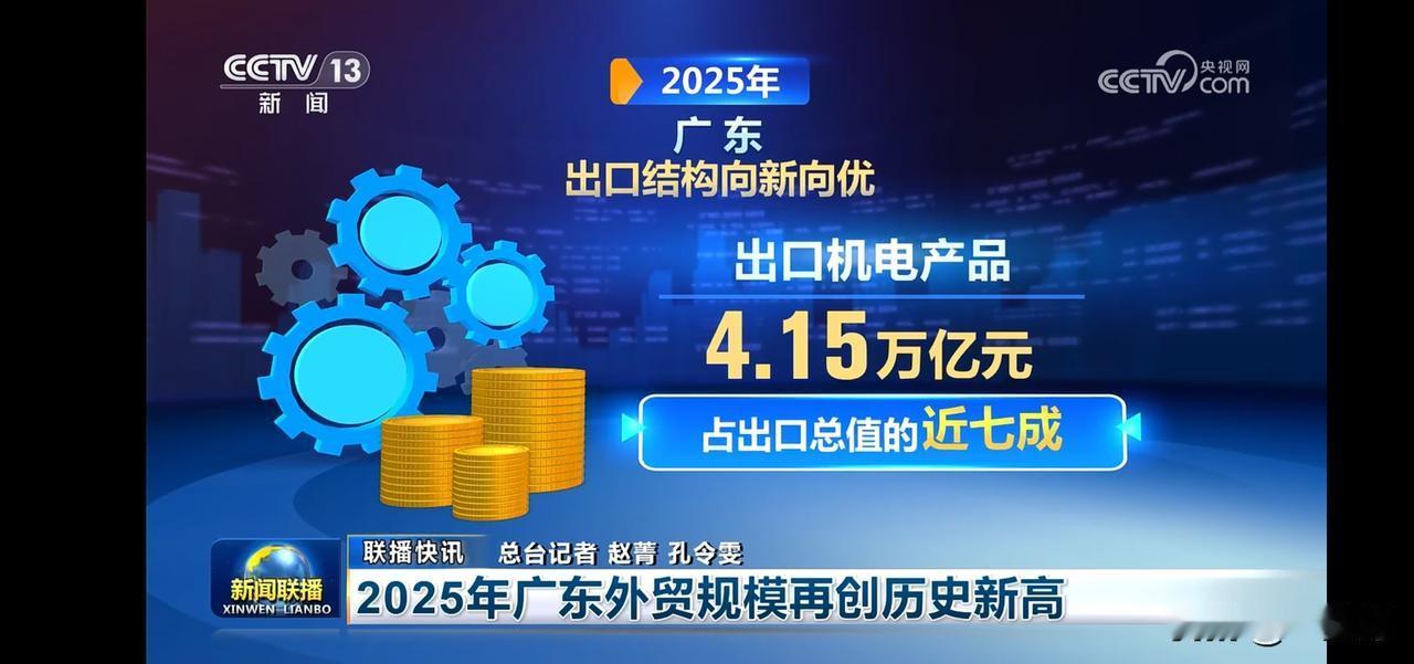 广东外贸再创新高,2025年进出口值达9.49万亿,同比增长4.4%,对全国外贸增长的贡献率达24.1%。 出口机电产品4.15万亿,占出口总值近七成。