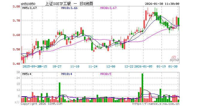 1月30日,截止午间收盘,上证50ETF工银(510850)跌1.58%,报3.666元,成交额863.68万元。上证50ETF工银(510850)重仓股方面,贵州茅台截止午盘跌2.18%,中国平安跌1.81%,紫金矿业跌8.33%,招商银行涨0.65%,寒武纪涨1.35%,兴业银行跌0.21%,长江电力涨1.73%,中信证券跌0.88%,恒瑞医药涨0.29%,工商银行涨0.96%。