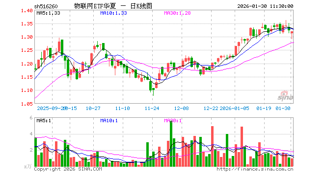 1月30日,截止午间收盘,物联网ETF华夏(516260)跌0.23%,报1.319元,成交额122.00万元。物联网ETF华夏(516260)重仓股方面,中际旭创截止午盘涨4.07%,立讯精密涨0.73%,汇川技术跌1.42%,兆易创新涨2.41%,美的集团涨0.95%,中兴通讯跌1.75%,科大讯飞跌2.48%,海康威视跌2.02%,豪威集团跌0.58%,海尔智家跌0.27%。