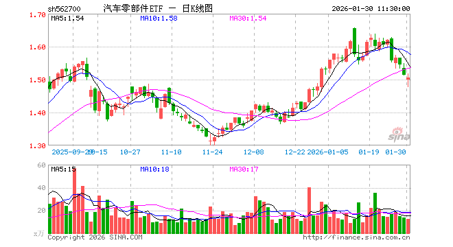 1月30日,截止午间收盘,汽车零部件ETF(562700)跌0.53%,报1.506元,成交额1839.46万元。汽车零部件ETF(562700)重仓股方面,汇川技术截止午盘跌1.42%,三花智控涨1.68%,福耀玻璃跌0.06%,拓普集团涨0.26%,长盈精密涨0.52%,赛轮轮胎跌0.50%,德赛西威跌0.86%,双环传动跌0.58%,银轮股份跌1.20%,华域汽车跌0.31%。