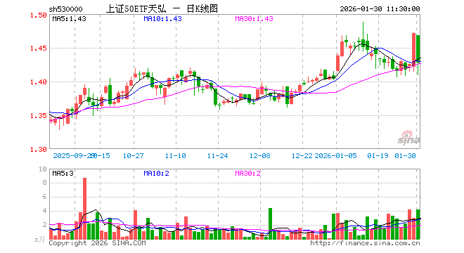 1月30日,截止午间收盘,上证50ETF天弘(530000)跌2.92%,报1.428元,成交额603.46万元。上证50ETF天弘(530000)重仓股方面,贵州茅台截止午盘跌2.18%,中国平安跌1.81%,紫金矿业跌8.33%,招商银行涨0.65%,兴业银行跌0.21%,长江电力涨1.73%,寒武纪涨1.35%,中信证券跌0.88%,恒瑞医药涨0.29%,工商银行涨0.96%。