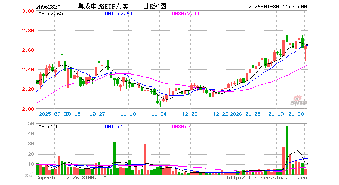 1月30日,截止午间收盘,集成电路ETF嘉实(562820)涨0.53%,报2.632元,成交额1424.31万元。集成电路ETF嘉实(562820)重仓股方面,寒武纪截止午盘涨1.35%,中芯国际涨0.14%,海光信息涨2.31%,兆易创新涨2.41%,澜起科技涨2.66%,豪威集团跌0.58%,紫光国微跌0.88%,长电科技跌0.53%,芯原股份涨6.97%,通富微电跌1.11%。
