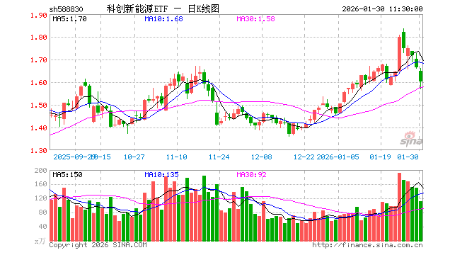 1月30日,截止午间收盘,科创新能源ETF(588830)跌3.78%,报1.602元,成交额1.80亿元。科创新能源ETF(588830)重仓股方面,晶科能源截止午盘跌6.68%,阿特斯跌5.72%,天合光能跌6.69%,容百科技跌2.85%,大全能源跌4.44%,厦钨新能跌3.67%,嘉元科技涨0.12%,天奈科技跌2.15%,孚能科技跌0.88%,固德威跌7.59%。