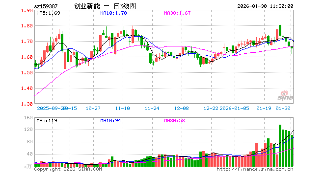 1月30日,截止午间收盘,创业板新能源ETF国泰(159387)跌0.90%,报1.652元,成交额1.70亿元。创业板新能源ETF国泰(159387)重仓股方面,宁德时代截止午盘涨2.93%,阳光电源涨3.30%,汇川技术跌1.42%,亿纬锂能涨2.17%,先导智能涨1.51%,欣旺达跌1.86%,天华新能跌5.20%,迈为股份跌4.35%,捷佳伟创跌3.13%,湖南裕能跌3.99%。