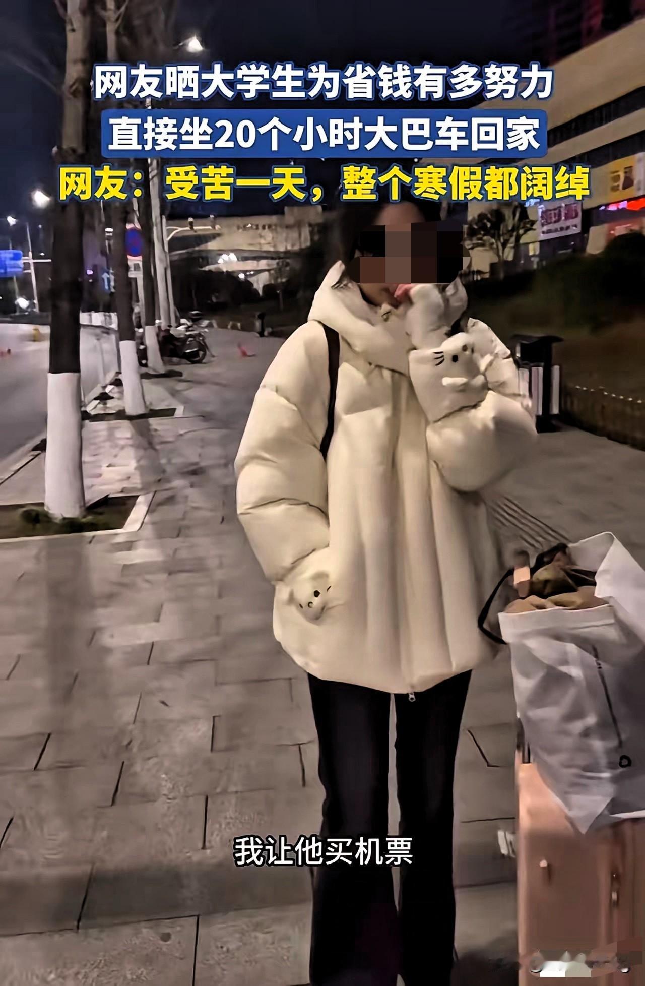 佩服现在的女大学生啊!爸妈转两千多让买机票回家,姑娘愣是为省1800块坐17小时大巴,家长又心疼又崩溃的心情,真的太能理解了!这事儿看着是小事,却戳中了很多家庭的心声,网友吵翻的背后,其实是对“懂事”的不同理解,有人夸她体恤父母,有人说没必要委屈自己。 但我觉得,这根本不是抠门,而是刻在骨子里的体谅,现在的年轻人能主动把父母的辛苦放在心上,愿意为省钱扛住舟车劳顿,这份心意比什么都珍贵。17小时的车程哪里是遭罪,分明是一堂成长课,让她懂得了赚钱的不易,学会了换位思考,这份清醒和懂事,比坐一趟舒服的飞机更有价值。 当然,对自己好一点没错,但在该懂事的年纪,能想着为家里分担,这样的孩子未来一定不会差。这份藏在省钱里的孝心,真的太戳人了。你觉得这位姑娘的选择值得点赞吗,换作是你会怎么选?