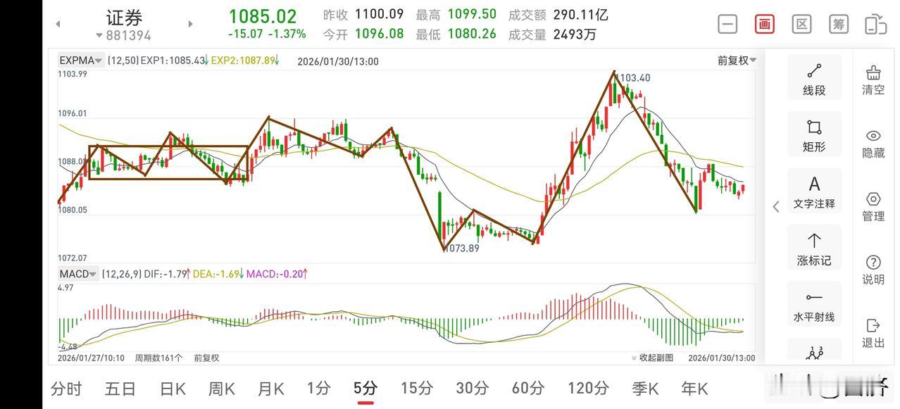 聊聊证券板块(2026.1.30) 证券板块虽然昨天来了跟中阳线,但此处并不具备发动行情的条件,只是不让指数跌的难看而已,再者,临近年底,各板块都处于区间震荡中,已无意发动进攻,所以在后面二周时间,都是以区间震荡为主,没有好的操作机会。 1.从30分钟图一上看,并没有脱离中枢震荡区间,可以预见后面二周时间,都会在这个区间来回震荡,如果你想高抛低吸,那就按5分钟乃至一分钟上去做,但对于散户来说,难度较大。 2.从5分钟图二上看,昨天下午的一笔强势上涨,它是由5分钟二买催动的,要想抓住这个买点,需要在一分钟去应对,这种要求是非常苛刻的,一般一分钟上的走势都是忽略不计的。目前在5分钟上回踩了5分钟一笔,下午会略有反弹,再进一步向下的空间并不大,所以此处可以考虑回补二成仓位,然后耐心等待,下周有望破昨天的高点,到时再把二成仓位退出来。总之,在这个区间尝试做一下高抛低吸,打发时间吧! 3商业航天妖龙目前正在走9笔日线,也是一个区间震荡,风险并不大,目前已经来到区间下沿,后面二周是可以看反弹的。 总之,不管是三大指数,还是证券板块乃至商业航天,指数都不会出现重大跌幅,风险并不大,无忧。证券板块动态 证券股如何