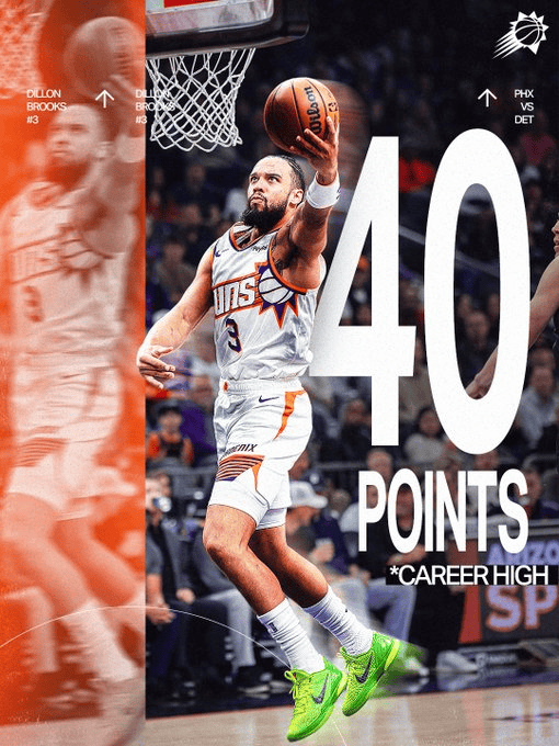 本场比赛,太阳球员狄龙-布鲁克斯出战32分钟,22投13中,其中三分球7投4中,罚球12投10中,得到40分7篮板4助攻1抢断1封盖。