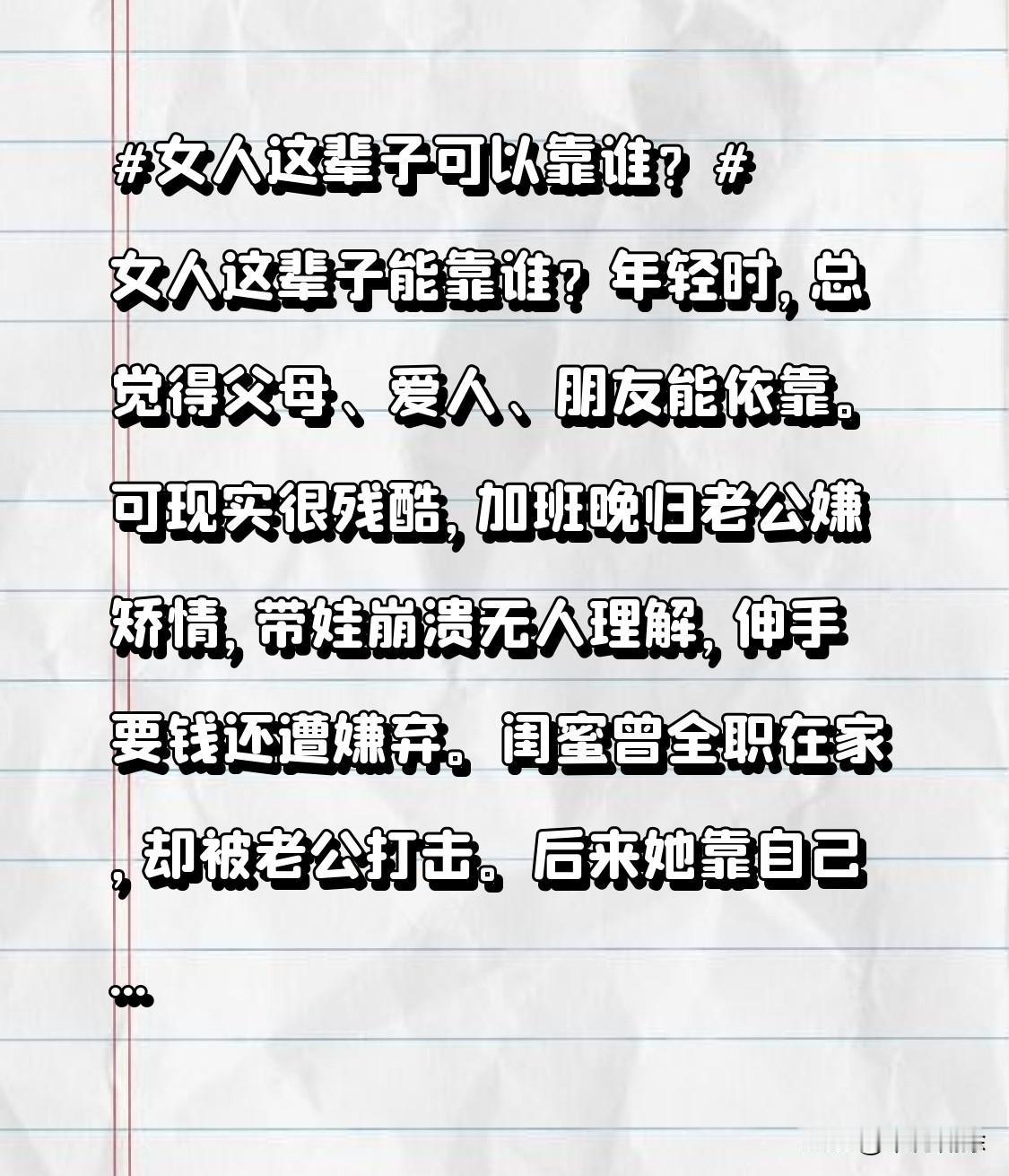女人这辈子能靠谁?年轻时,总觉得父母、爱人、朋友能依靠。可现实很残酷,加班晚归老公嫌矫情,带娃崩溃无人理解,伸手要钱还遭嫌弃。闺蜜曾全职在家,却被老公打击。后来她靠自己学剪辑接单,赚到钱时喜极而泣。女人啊,靠自己才最靠谱,有底气,有尊严,做自己的太阳!