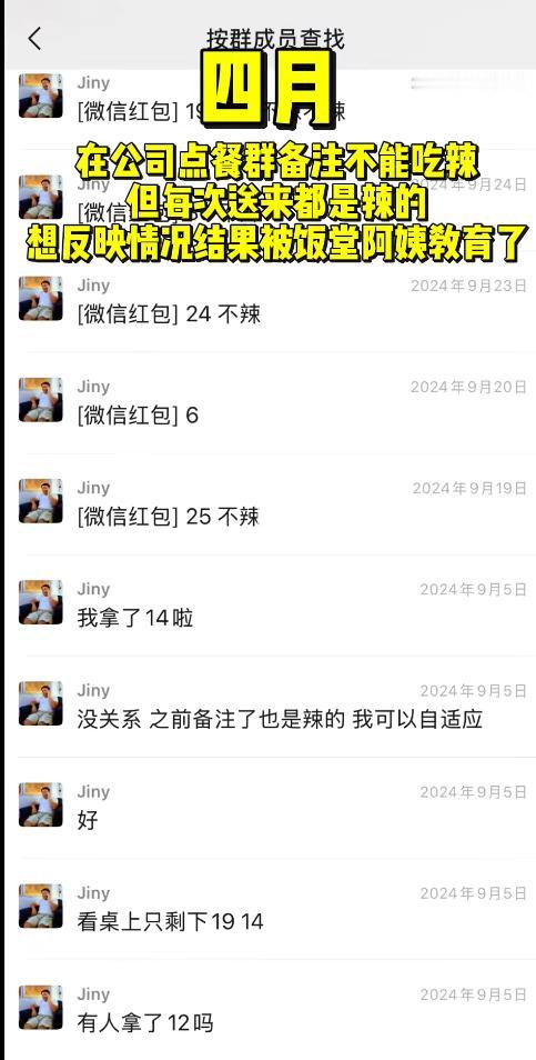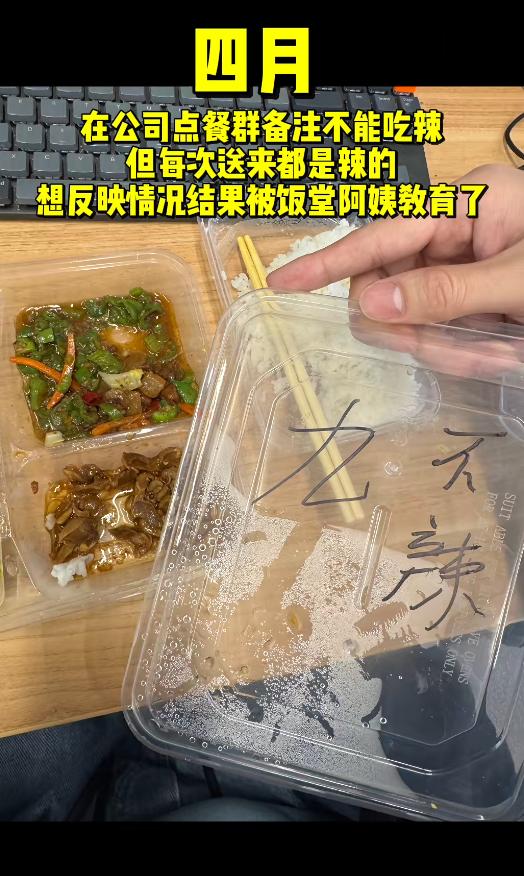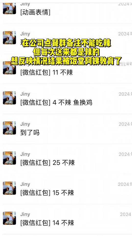 笑不活!男子备注不吃辣,连续两年都送辣的,食堂阿姨解释自己没放辣,阿姨女儿出来解释还原真相,原来是做好菜后,将青椒给挑出来了。 这件事要从一段年会有趣事件的视频说起,一博主转发了年会上的一段视频,引发了很多围观。 于是网友就找到了当事男子,男子在自己发布的2025年年度时刻视频,分享了2025年4月份发生的事情。 男子称自己在公司的点餐群点餐,自己不能吃辣,特意将自己的群聊名称改成:xx吃辣会死。 于是每次点餐的时候,也会备注不能吃辣,但是阿姨每次送过去的菜吃起来都会辣。 男子晒出一份餐盘,餐盘中看起来是辣鸡胗,确实没有明显的辣椒,但是男子吃的都是满头大汗。 从男子晒出来的点餐记录,从2024年到2025年每天都在阿姨那里点餐,且每次餐的品类都固定的,只能在已有的选择选,所以男子每次点餐都是在转微信红包的时候,备注了价格及“不辣”。 但是食堂阿姨更是说鸡胗没有放汤汁在里煮,鸡胗100%不会辣。 这时候食堂阿姨的女儿出来解释,称她母亲确实没有放辣椒,因为每次都是将他餐盒的青椒给挑出来的。 听到食堂阿姨女儿的回应,网友笑不活了,直呼小伙子,要再练练。 看到这段视频及食堂阿姨女儿的解释,有不能吃辣的网友,觉得阿姨就是在狡辩,不考虑别人,该网友直呼,有些人是不能吃辣,一吃辣就容易过敏,而男子本人就是那种:睡液神经接到汗腺上了。 还有网友直接点明了关键点,是阿姨炒大锅饭,加了辣椒,然后在给男子装盘的时候,直接将辣椒给挑出来,这就导致了不吃辣没放辣椒,还是很辣的情况。 “辣椒帮他挑出来的”,这句话网友笑不活,但也解释了一个情况,如今很多人遇到事情的时候,都会遇到那种听不懂话的人,那遇到这种情况的时候,那就要花心思去解释清楚了。 对于该男子遇到的情况,与食堂阿姨的解释,您怎么看?