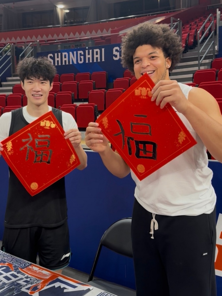 赛前,上海球员偰李永炜和外援洛夫顿用毛笔写福字。赛季至今,上海16胜4负位列联赛第三位。