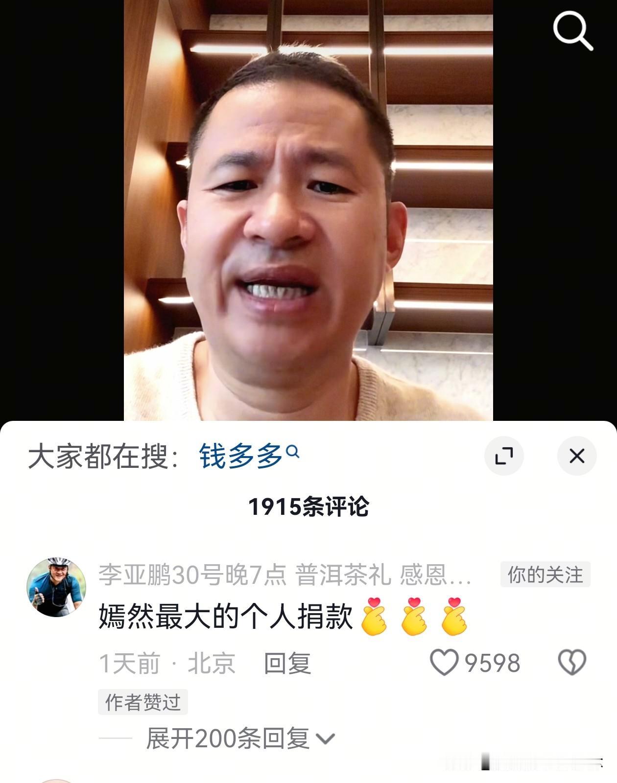 刚刷到视频,一个人说自己给嫣然一共捐了5000万,我以为他在吹牛,评论区李亚鹏亲自回复:“嫣然最大的个人捐款。” 这个人叫钱峰雷,早在2012年,他就参与了李亚鹏发起的嫣然天使基金慈善晚宴。当年,他以2000万元拍下和田玉观音,成为当晚“标王”;2013年,又以3000万元拍下油画,连续两年刷新晚宴竞拍纪录。 他还有个名字叫“钱多多”,是李亚鹏在晚宴上对他的称呼。比起陈光标“中国首善”的高调,钱峰雷显然低调得多。 据公开资料,钱峰雷是浙江恒峰国际控股有限公司创始人及董事长。关于他如何创业起家,网上传闻很多。 除了给嫣然捐款,他还在汶川地震,玉树地震,雅安地震中捐款,最近的一次是在香港大埔宏福苑火灾中以个人名义捐款1200万。 要不是李亚鹏亲自回复,估计好多人会觉得他在蹭流量,原来他和李亚鹏一样,不高调,不辩解,默默做着善事!为他点赞,希望他被更多人看见! 李亚鹏 嫣然天使公益