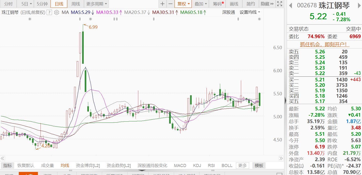 昨日涨停的珠江钢琴(002678.SZ)今日跌7.28%,报5.22元,总市值70.9亿元。珠江钢琴公告,预计2025年度净利润亏损3.95亿元–3.5亿元,上年同期亏损2.36亿元。受国内外经济形势波动、消费市场结构调整等多重外部因素交织影响,钢琴主业市场需求持续大幅萎缩;叠加公司产能收缩推高单位成本、人员优化及资产减值计提等内部因素,公司利润总额较上年同期下滑。(格隆汇)