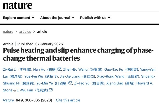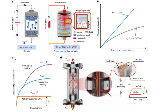 针对这个长期矛盾,浙江大学范利武教授团队近日在Nature发表研究成果,提出了一种基于“滑移强化接触熔化机制”的创新方案。通过给储热容器内壁涂上了一层200纳米厚的超薄涂层,并结合预热层同时实现了表面滑移以及脉冲加热,团队首次将相变热池的功率密度推至超过1兆瓦每立方米,相比传统储热装置提升十倍以上。
