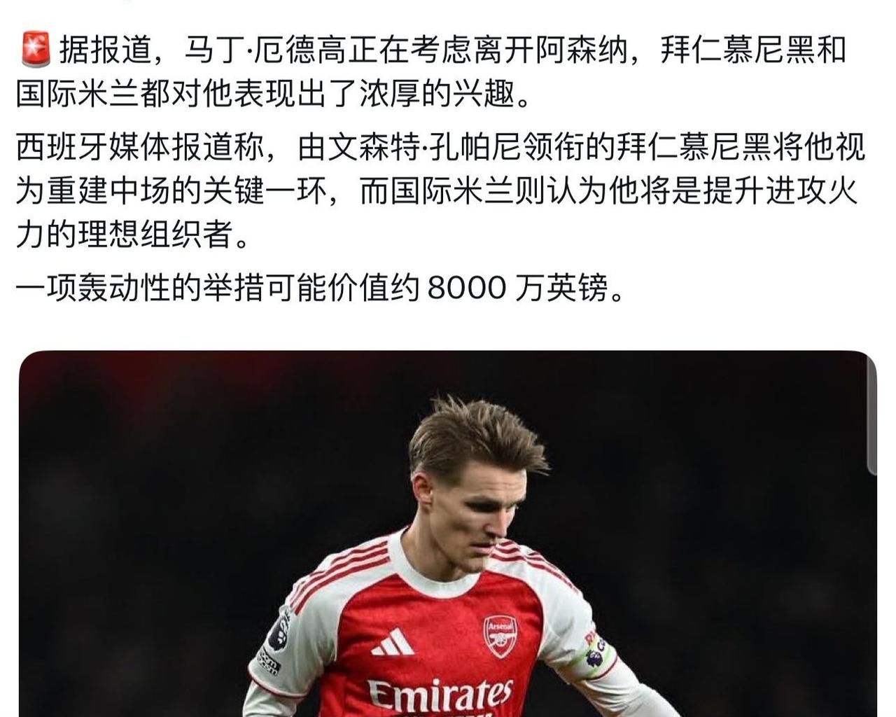外面说厄德高很有可能离开阿森纳! 目前球队还没夺冠,有些人就要走吗? 国际米兰,拜仁都对他有意思。 英超踢不了,就去意甲,德甲发展吧。[可怜]