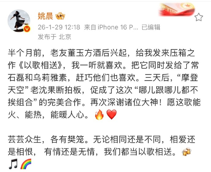 李健给姚晨新歌打call 李健给姚晨新歌打call,姚晨全新单曲《以歌相送》上线