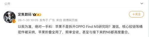 近日,行业内传出消息:苹果为加速首款折叠屏iPhone的研发进程,特意购入OPPO旗舰折叠机型FindN5进行拆解研究,其核心的铰链结构等关键技术被苹果参考采纳。这一细节不仅凸显了OPPO在折叠屏领域的技术领先地位,与此同时,OPPO在全球及中国智能手机市场的销量也实现逆势增长,展现出强劲的综合竞争力。