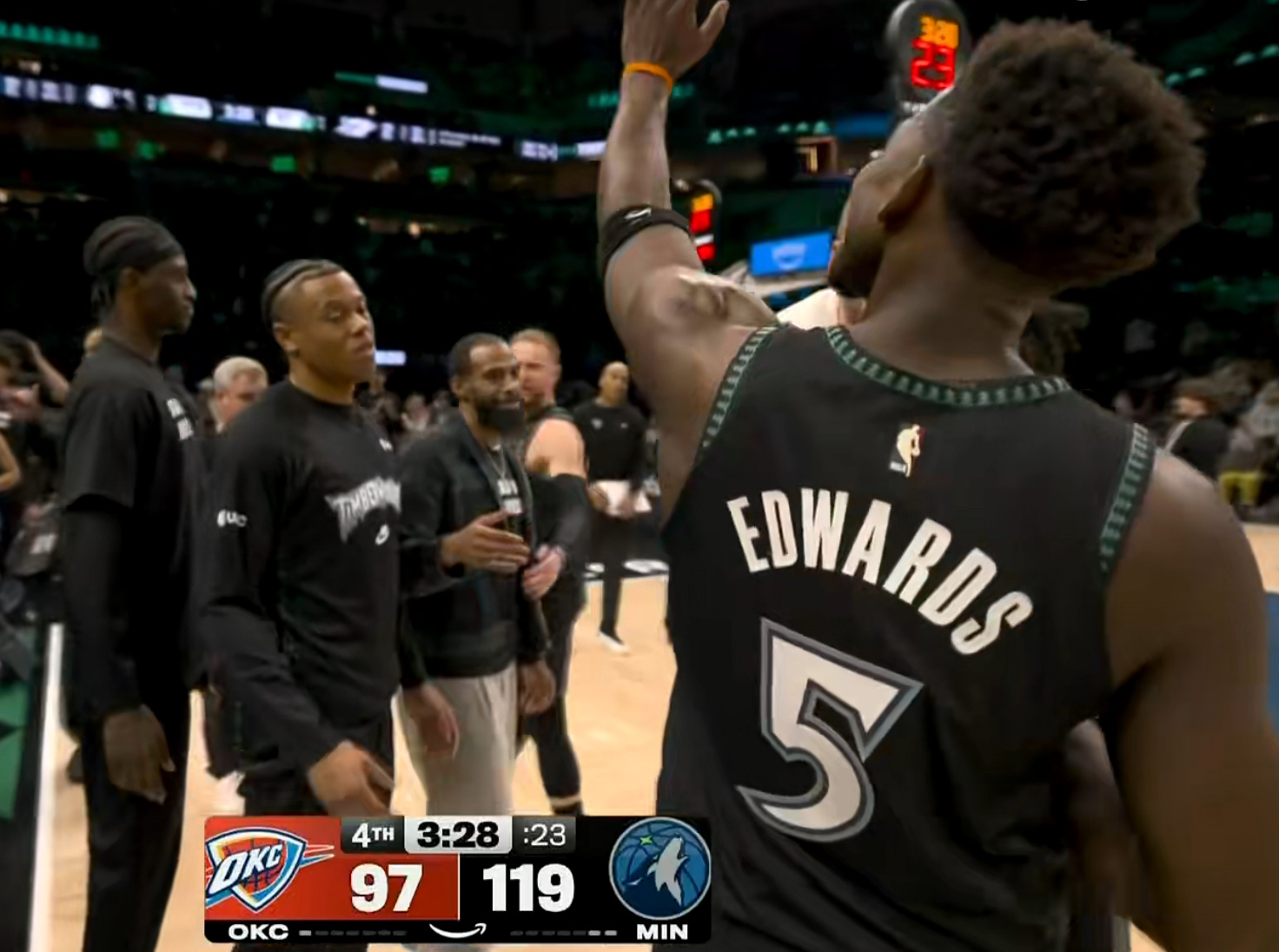 爱德华兹开局定调,受伤回来收比赛,其他对手就算了,这是上赛季淘汰他们的雷霆,必须狠;全队三分球是惊人的47中22,华子里德4个,麦丹是开挂的5中5。