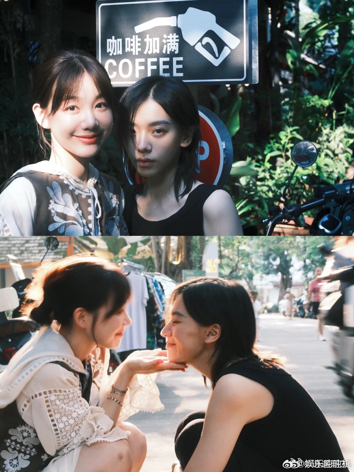 窦靖童骑着“二八大杠”自行车,穿过了大街,又走小巷,母女同款的大长腿成功抢镜。