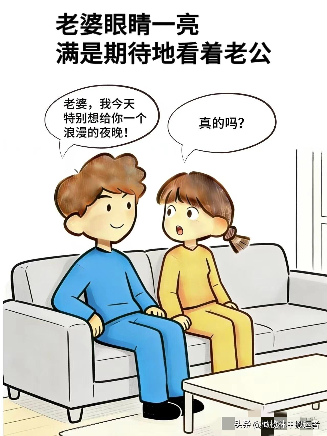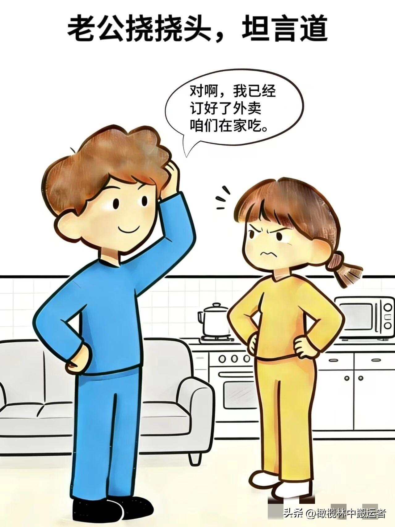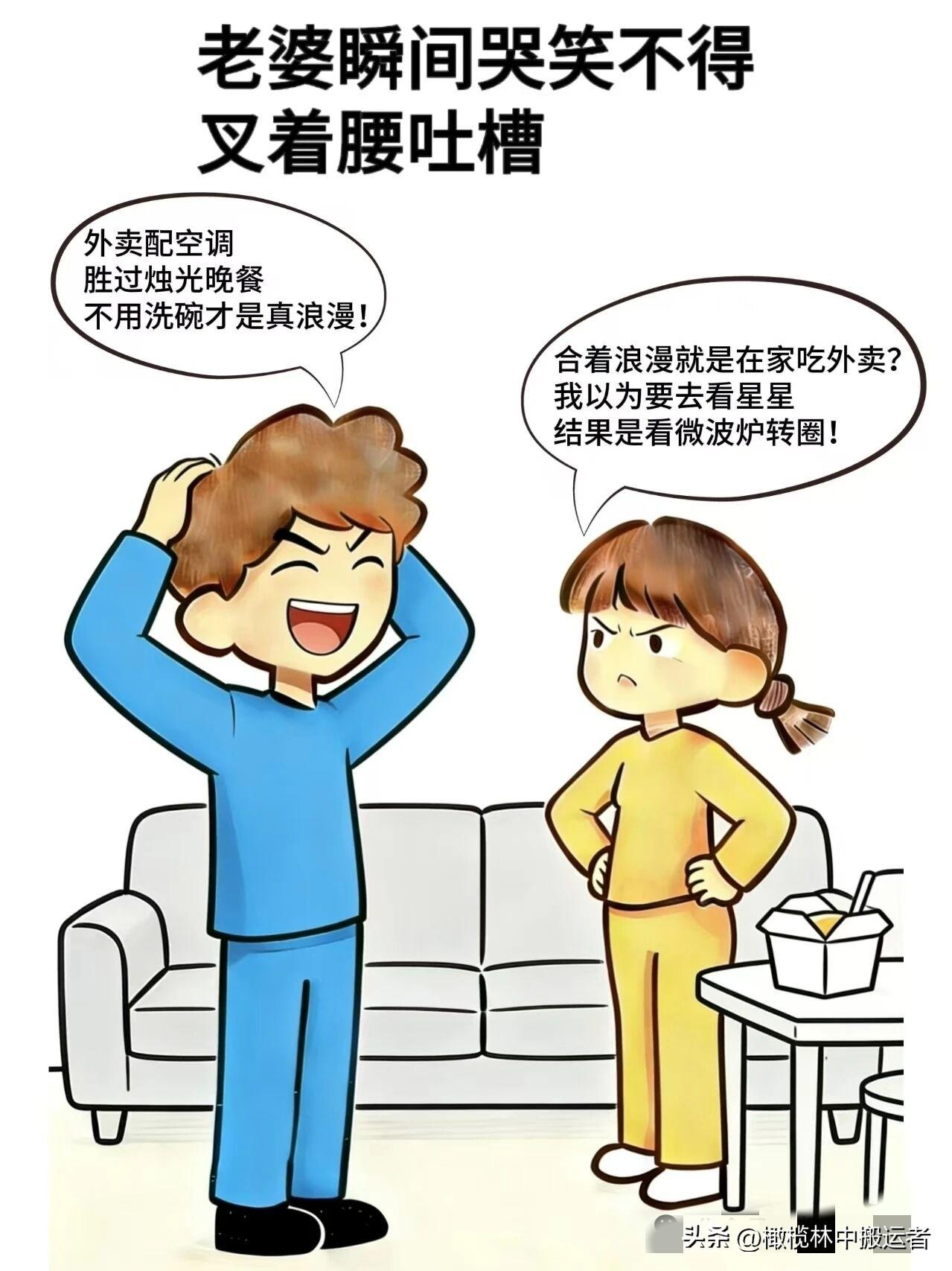 趣味漫画:老公:我要给你一个惊喜,老婆:真的?老公:对啊,咱们就在家吃外卖,老婆:合着浪漫就是在家吃外卖,老公:不用洗碗才真浪漫