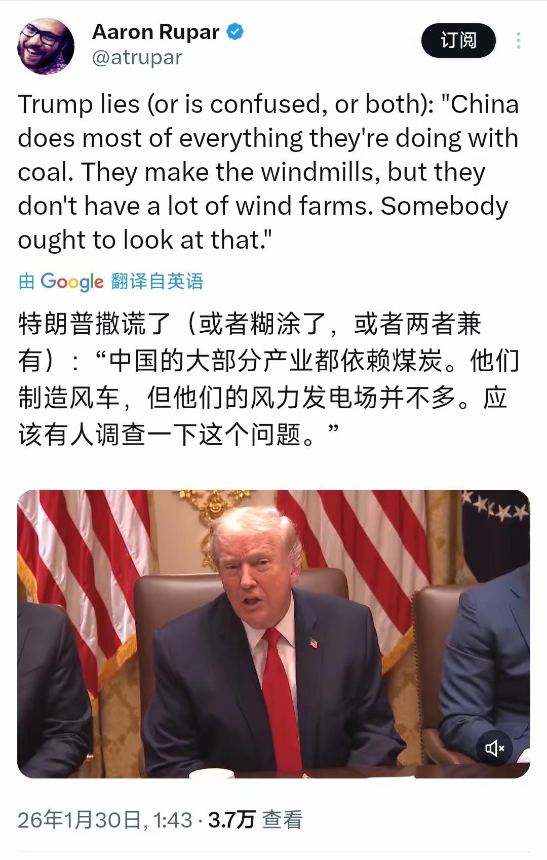 特朗普:中国大部分产业都依赖煤炭 特朗普1月29日在内阁会议上称:“中国的大部分产业都依赖煤炭。他们制造风车,但他们的风力发电场并不多。应该有人调查一下这个问题。” 四月份他不是来中国吗!领他去看看风力发电场是长什么样子的!让他见识见识,也让他把嘴闭上! 不过,这都是表象,或者说是故意这么说的,可不要以为他们不了解中国,他们要比多数中国人还要了解中国的情况。 前几天斯洛伐克总理就讲了,他与特郎普见面交谈中,就发现特郎普有精神问题,所以在它身上所出现的一切都是不用奇怪,这是它的正常表现。 大家对此怎么看?欢迎在评论区留言,共同交流探讨!