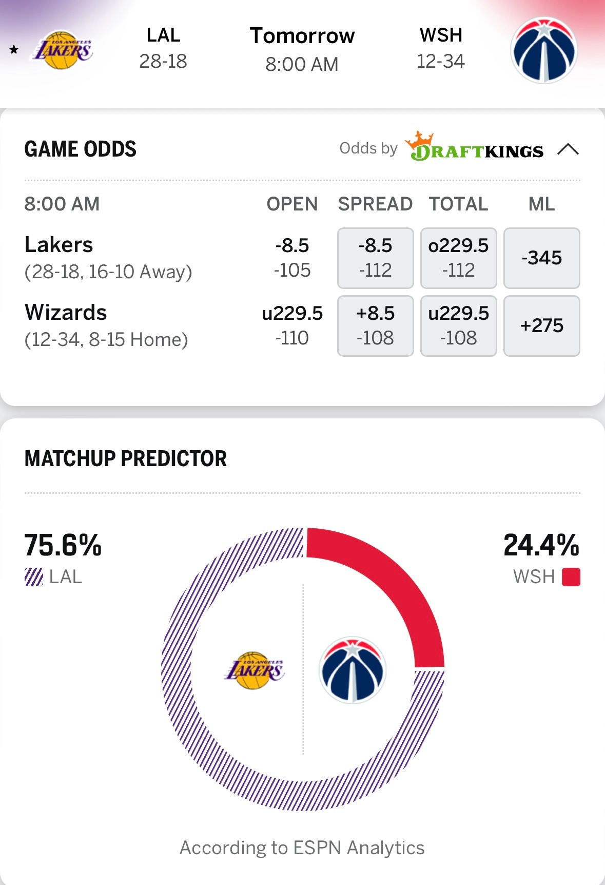 湖人明日8点对阵奇才,ESPN给出获胜概率:湖人75.6%,奇才24.4%。里夫
