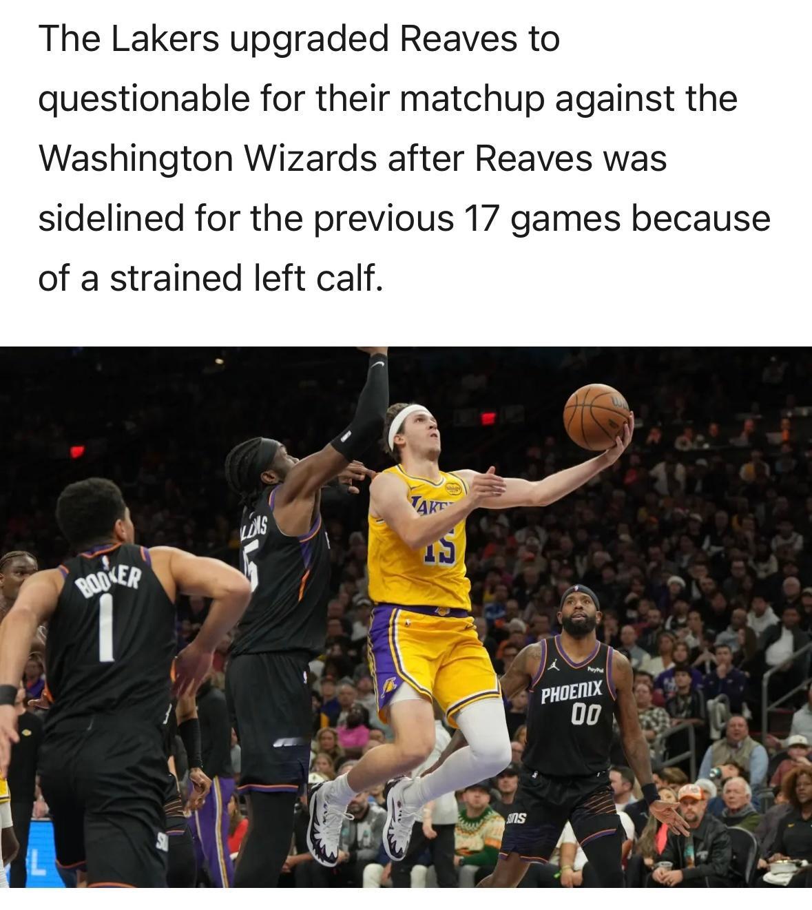 湖人明日8点对阵奇才,ESPN给出获胜概率:湖人75.6%,奇才24.4%。里夫斯在伤缺17场比赛之后,有望迎来复出。当前指数,湖人客场-8.5。 湖人vs奇才