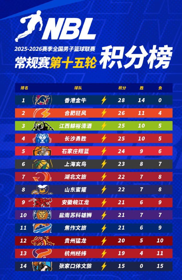 配文:[积分榜]2025-2026赛季NBL常规赛积分榜(截至第十五轮结束)