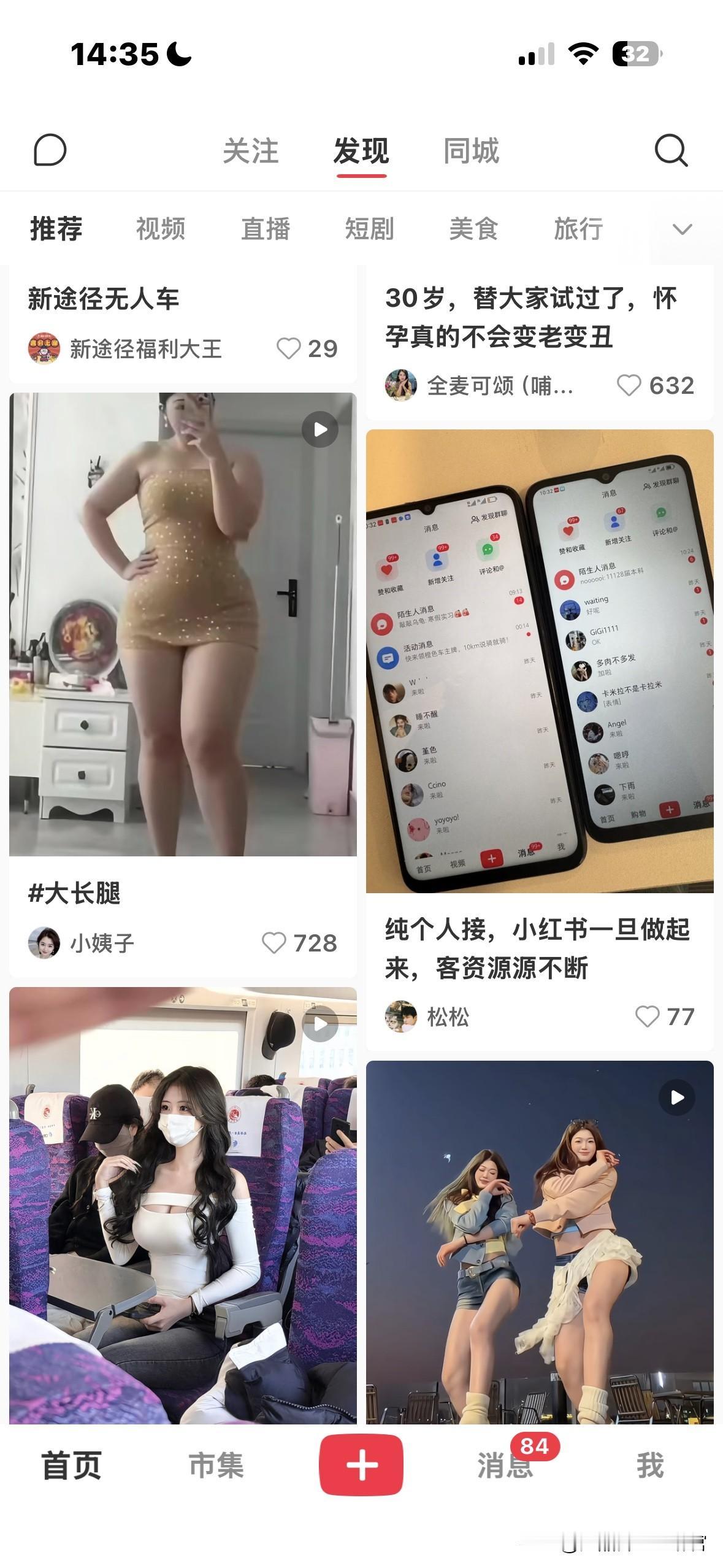 小红书乱象,是审核漏洞?还是平台纵容呢? 作为一个资深80后,对小红书一直无感,很多年前注册的号,也好些年没登录了 最近为了备份自己的视频,发到小红书备份。没任何游览,也无任何互动环节。偶尔会看一下首页推荐…作为一个成年人,也不惊大呼尺度大。特意测试了连续举报非法内容和无兴趣标注,结果依然无效。挑几个能发的截图给你们看看吧。 最后我想说的是,作为一个用户过亿的平台,审核机制如此简陋吗?哪怕1000块钱开发一个关键词审核模块,也不用如此泛滥… 话说前几个还传出小红书被约谈……这约谈结果…好尴尬小红书平台机制 小红书乱审核 小红书通病