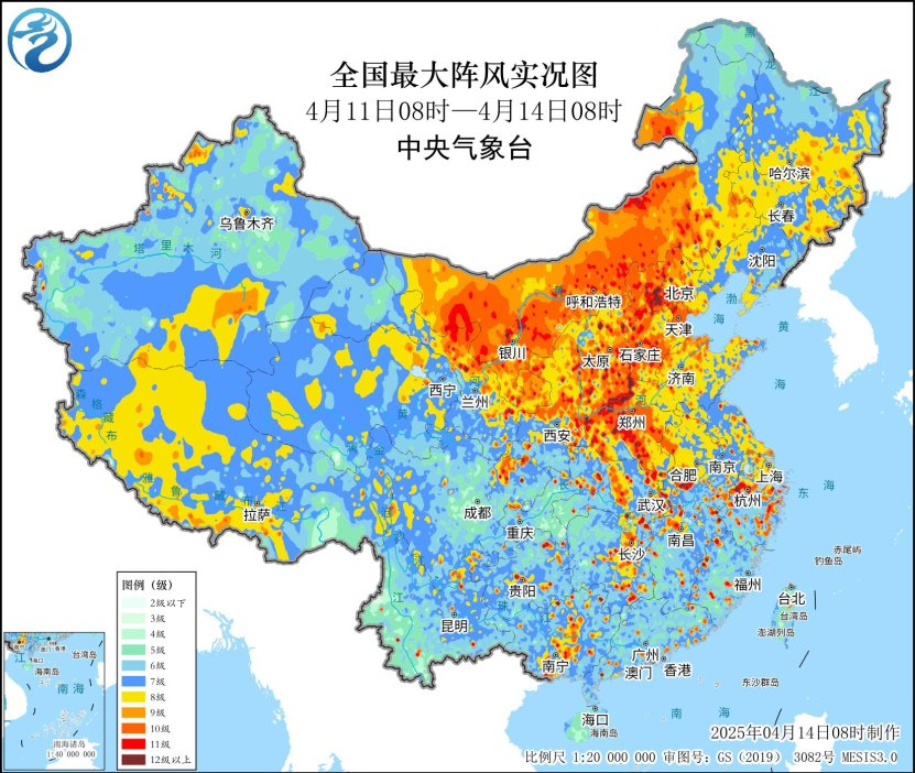 2025年4月10日至14日,23个省(区、市)出现12级以上阵风,64个国家站最大风速破历史极值,北京市发布近十年来首个全市大风橙色预警。伴随极端大风过程,中东部出现近十年来最大范围沙尘天气,覆盖面积超430万平方公里,沙尘最远传输到了海南北部。